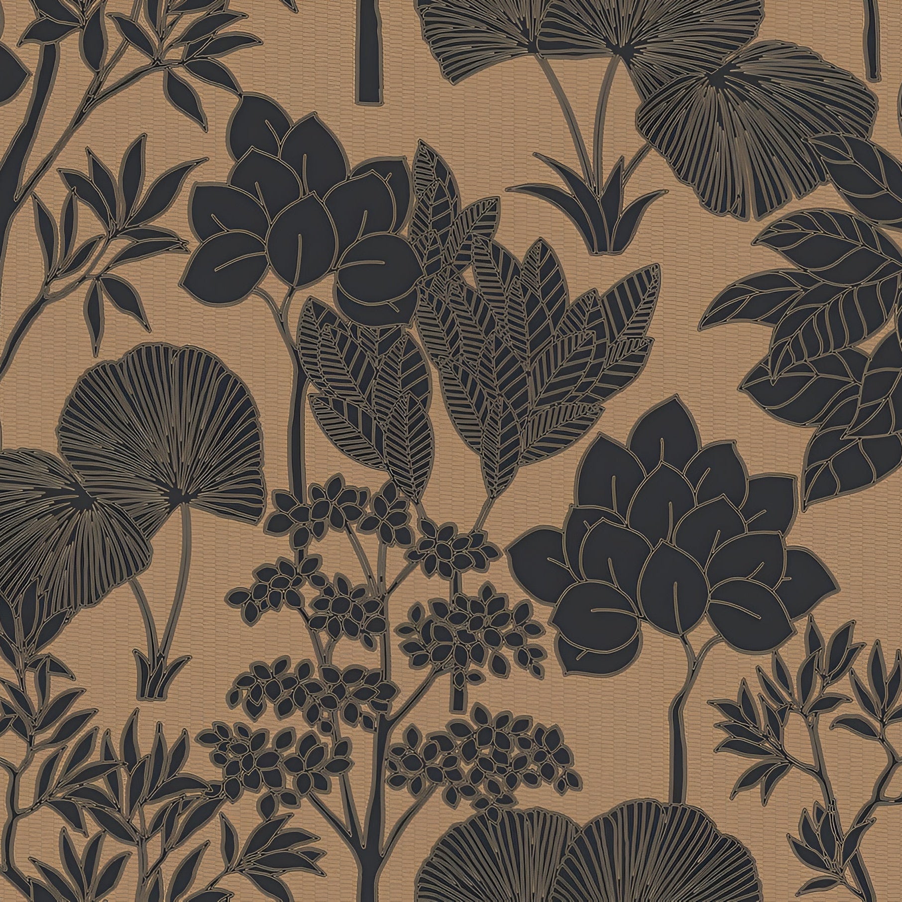 Structural wallpaper with a floral pattern of leaves and flowers INARA - NOIR/DORÉ dark beige