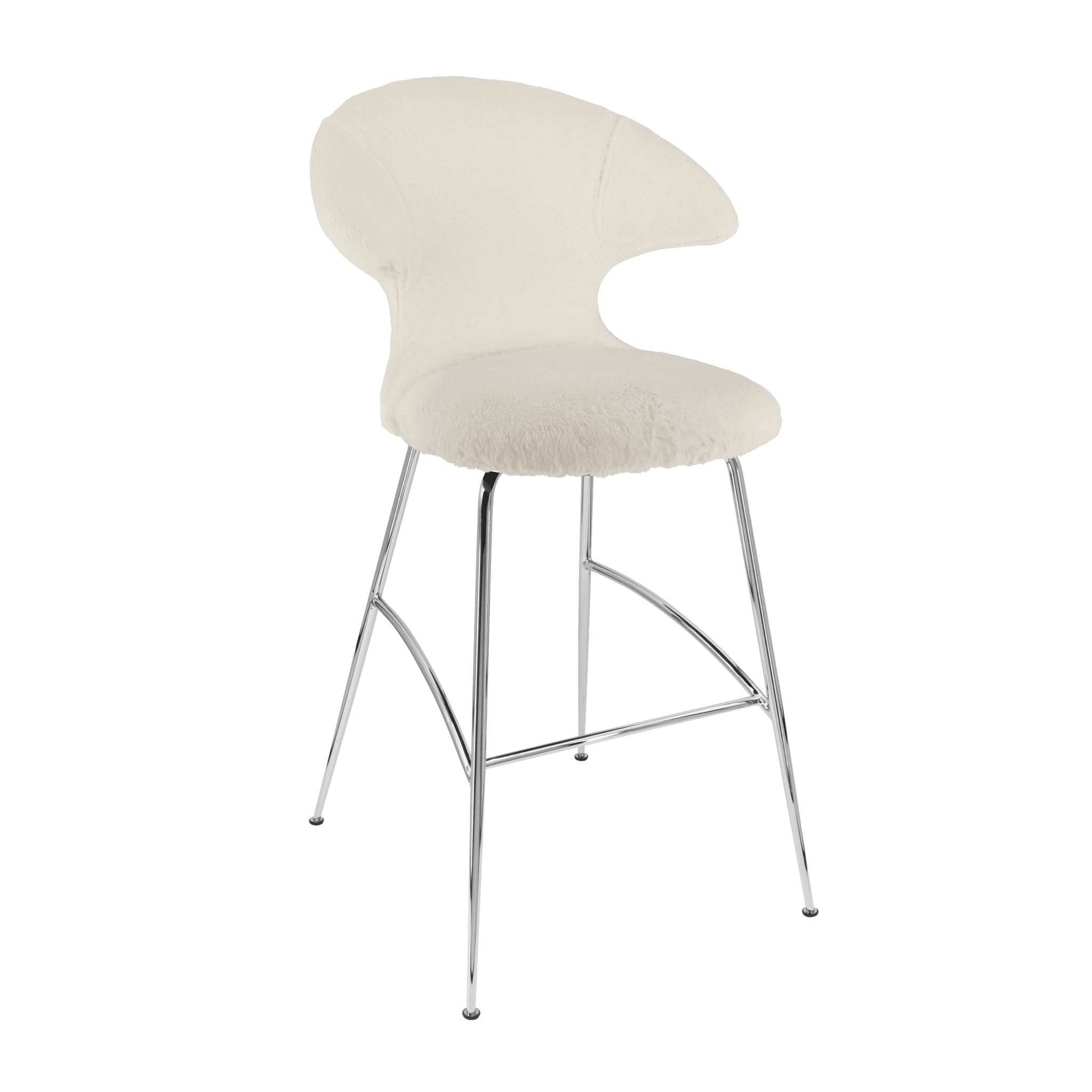 The stool Time Flies is available with legs in gold, silver, and black, offered in 17 carefully selected shades of the fully recycled Horizons fabric. Additionally, the chair is available in two cozy variants from the Teddy Bear fabric collection: plush brown and plush white.