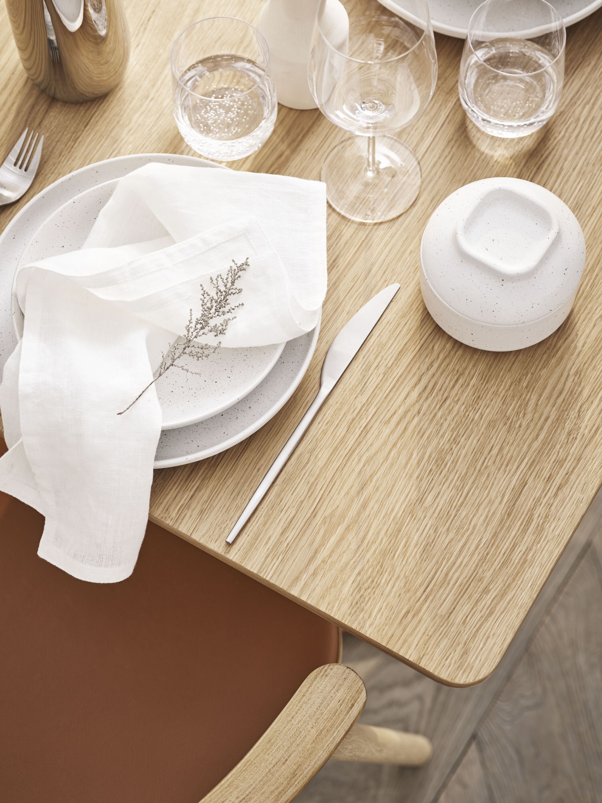 Table Turned is a harmonious combination of minimalist form and natural beauty. Made of lacquered oak, both in the tabletop and the base, it emphasizes the warm and timeless character of the wood. The tabletop is finished with a veneered surface in white, pigmented lacquer, which adds visual lightness. The stable base made of solid oak gives the table durability and elegance.