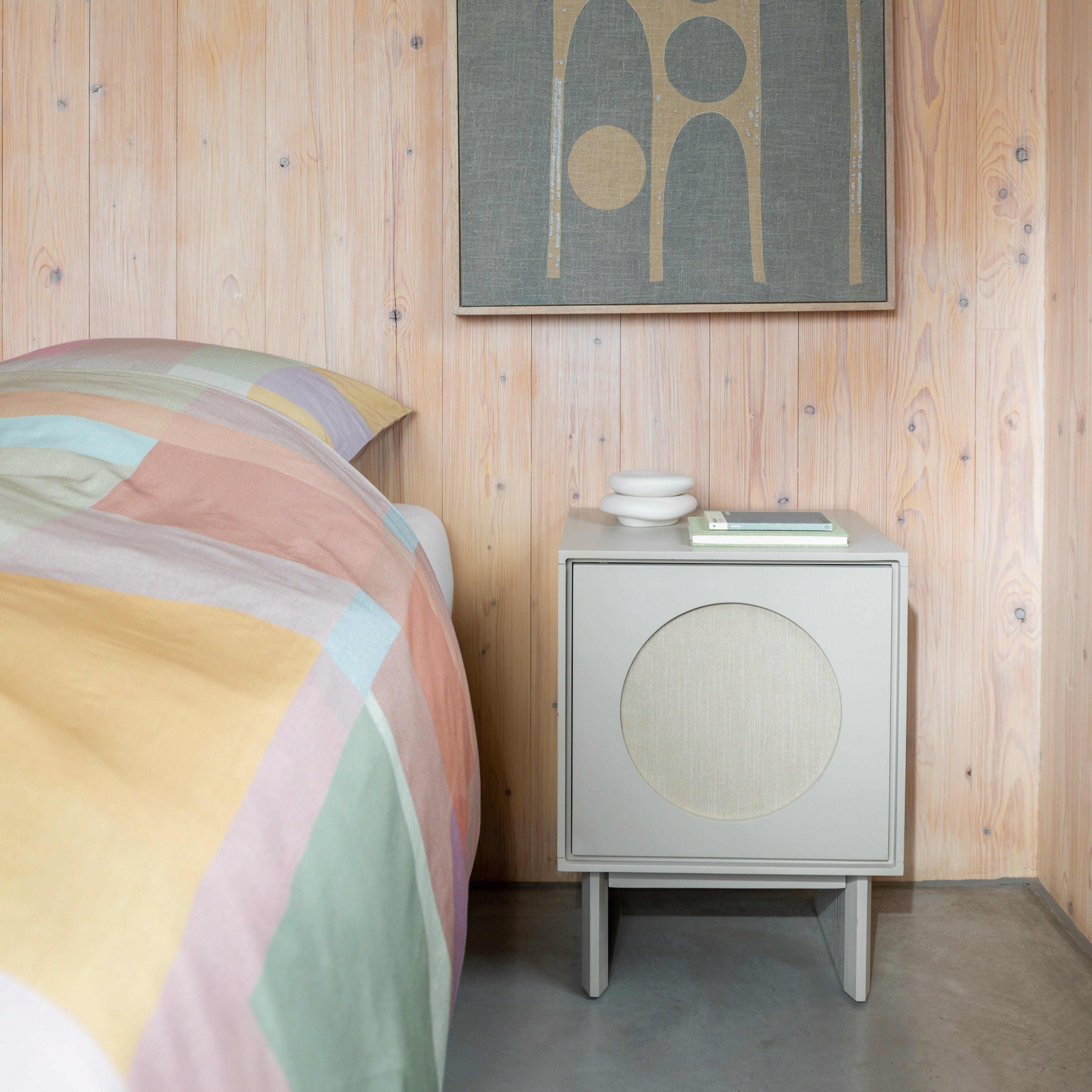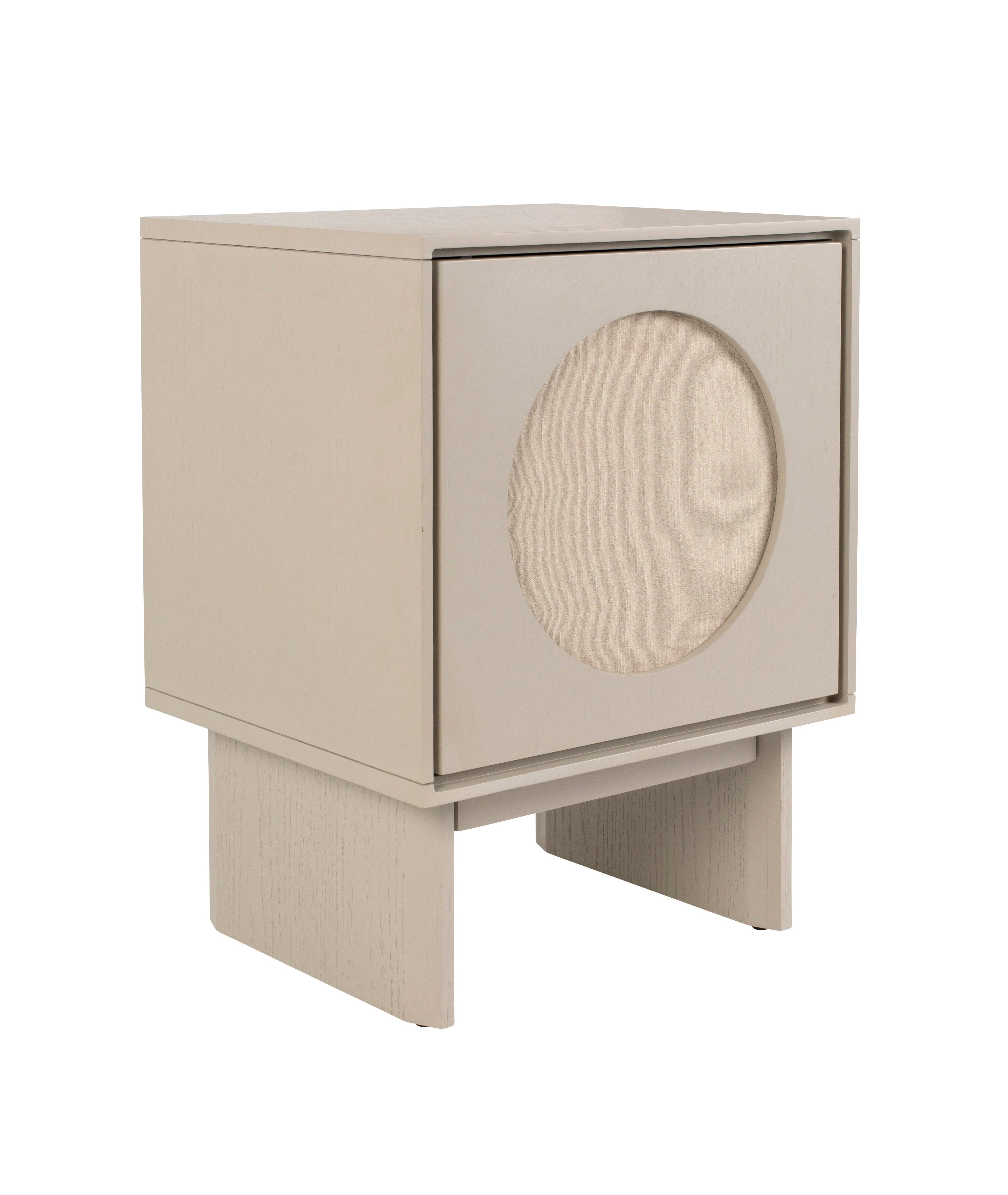 Door cabinets Twin adorns a soft, material circle. Spacious partitions with the shelf offer a place to store necessary things. Sleep legs ensure stability, and painted wood emphasizes the natural beauty of the cabinet.
