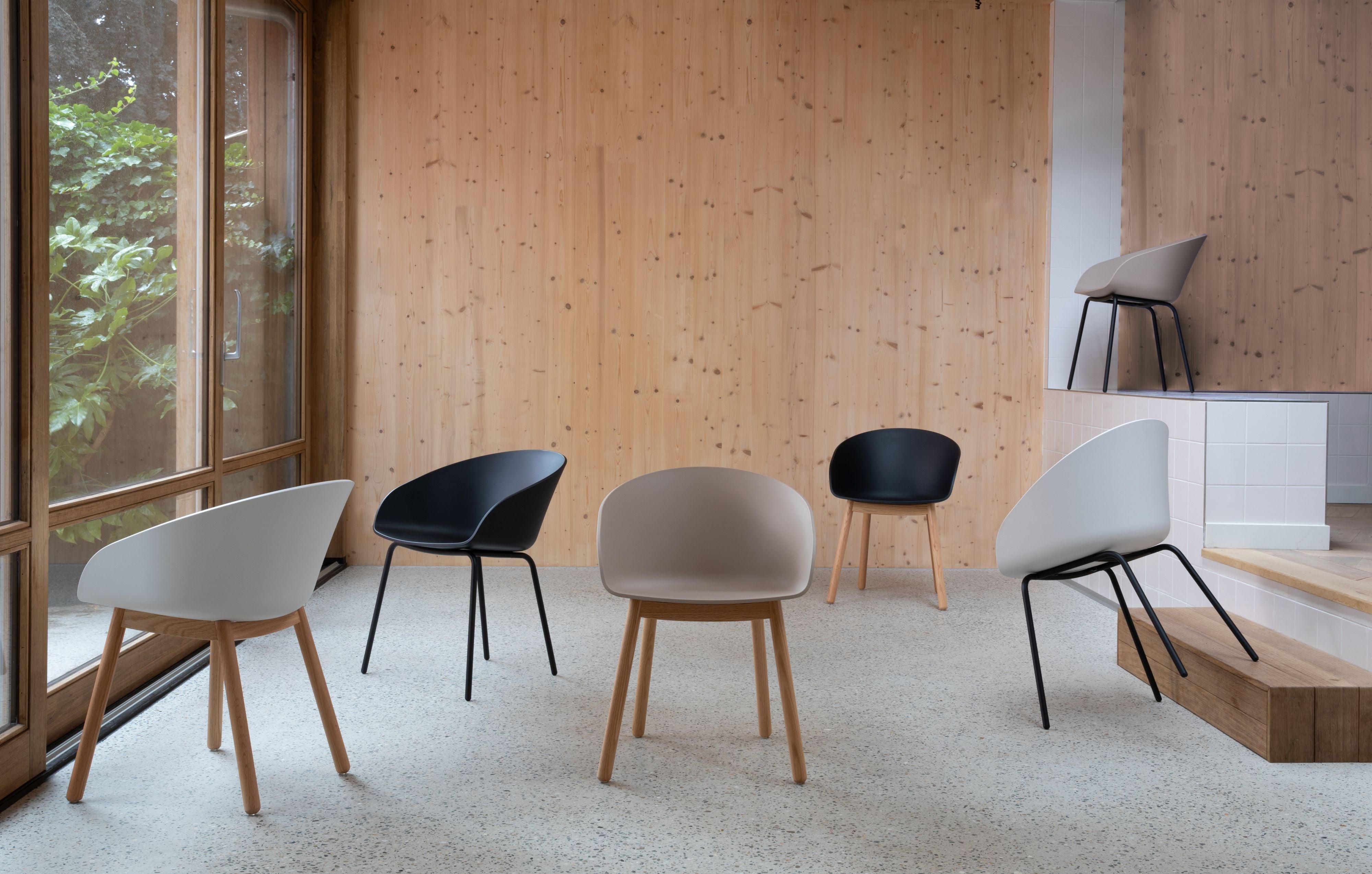 The seat is made of 90% of recycled plastic and is available on the basis of natural oak or powder -painted black steel. Void can slide under any table, leaving space for really important things, such as life space.