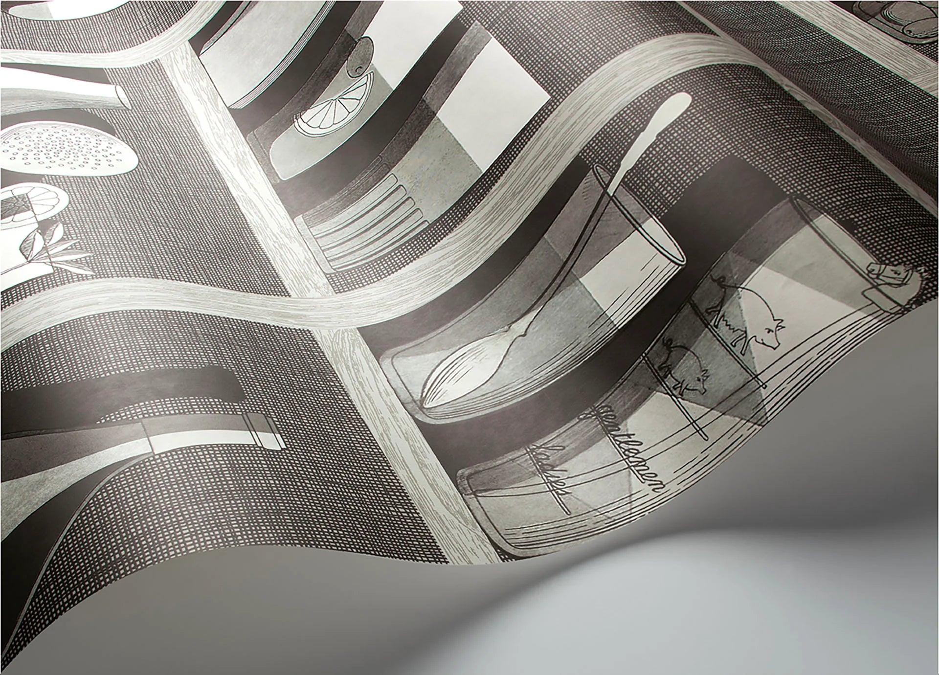 Wallpaper with bar and bottle motif FORNASETTI SENZA TEMPO - Cocktails gray
