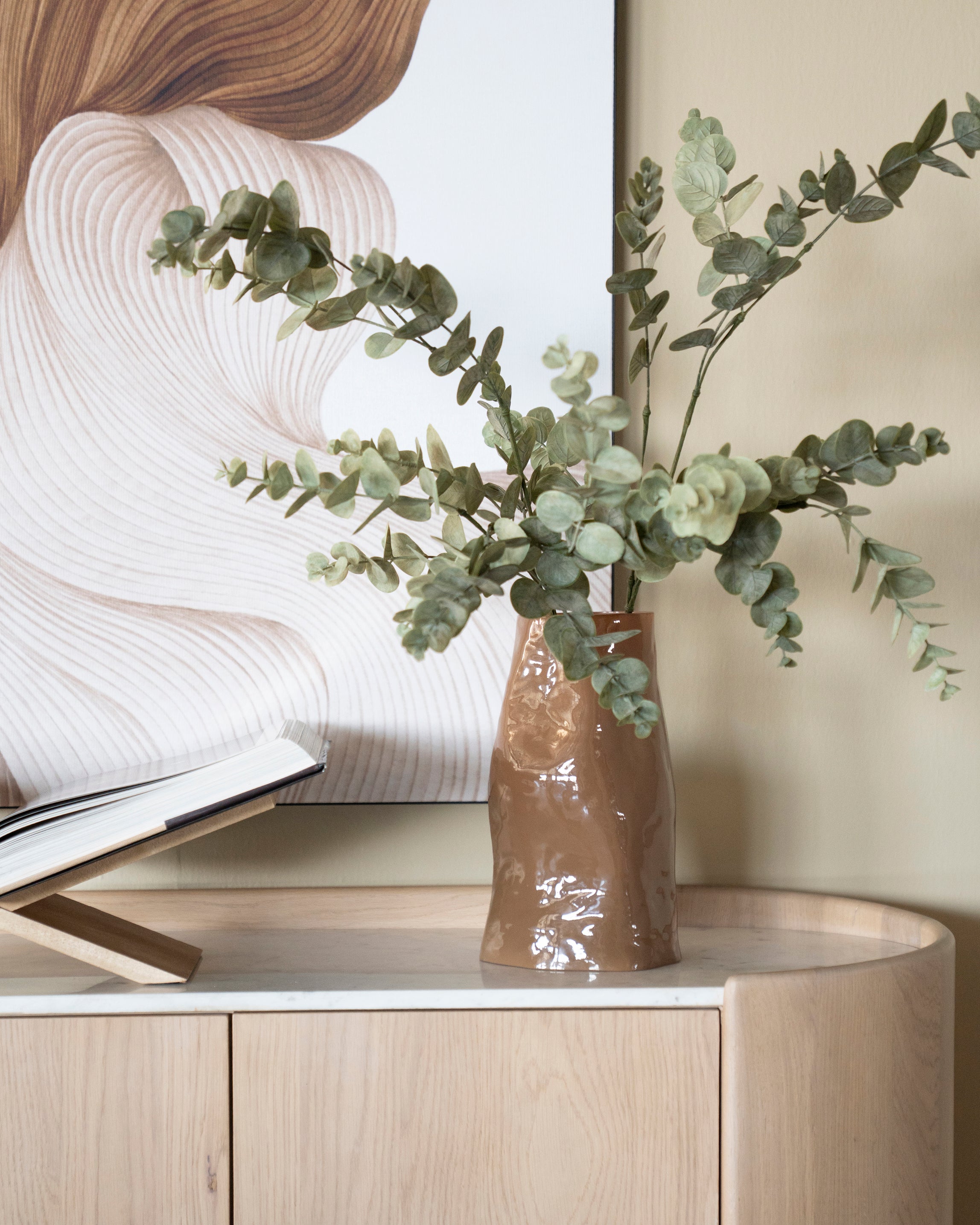 The Boyna vase is a combination of minimalist form and organic lightness. Its irregular, subtly undulating shape resembles hand-molded ceramics, yet it is made of blown glass, which gives it elegance and a modern character. The matte, milky color scheme makes the Boyna perfectly complement interiors in Scandinavian, natural, Japandi, or modern organic styles. The vase looks beautiful on its own as a decoration, but it also harmonizes well with bouquets of dried grasses or single branches.