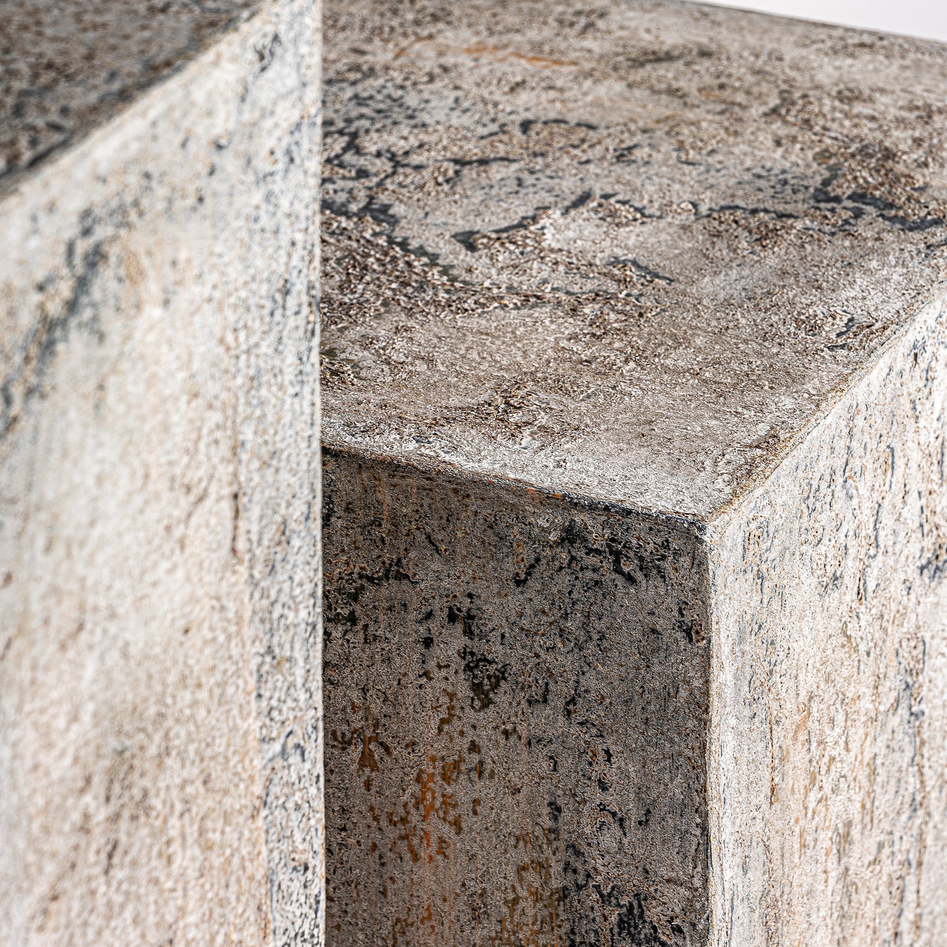 The side table set Arvit is a unique combination of raw aesthetics and decorative functionality, inspired by industrial style with a touch of vintage. This side table set stands out with its striking form and subtle patina effect, giving it character and timeless charm. With varying heights, the side tables for the living room are perfect as bases for plants, decorations, or designer accessories, creating a cohesive and stylish arrangement.