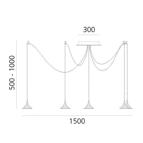 Chandelier Unterlinden Free is a modern interpretation of a classic lighting form, distinguished by its complete freedom of arrangement. Designed by the renowned studio Herzog & de Meuron, this exceptional chandelier consists of five independent light sources, suspended on cables that are 2.5 meters long. All lead to a single central point, allowing for the creation of diverse compositions, perfectly tailored to the character of the interior.