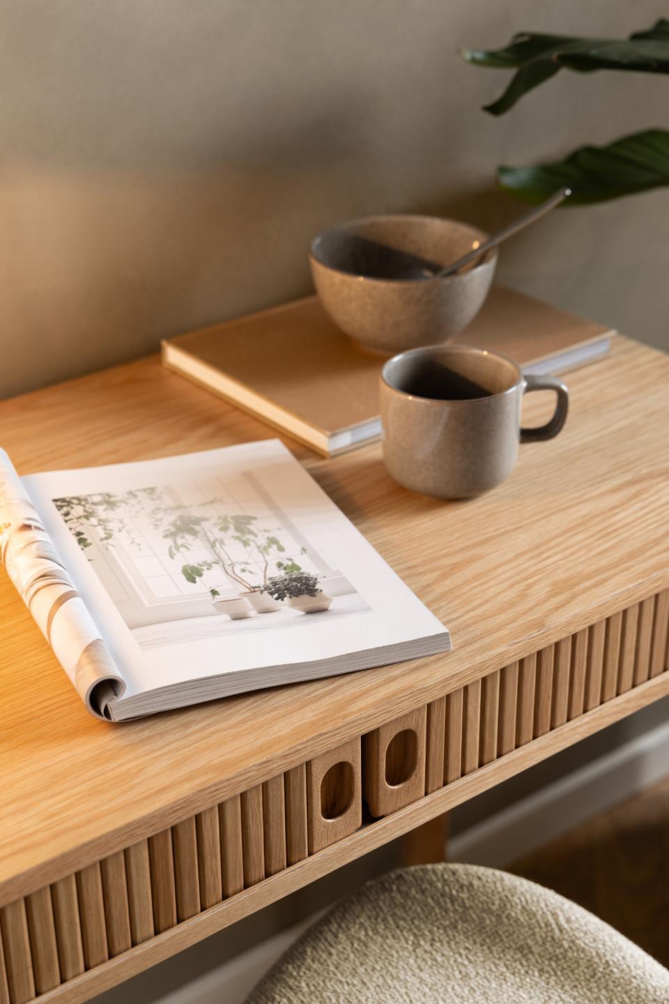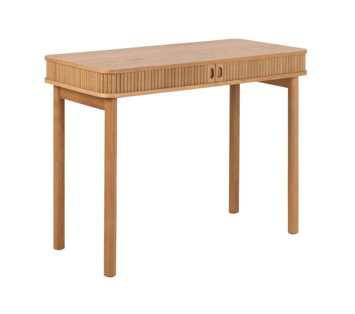 Langley je elegantní psací stůl s moderním designem, ideální do každé stylové kanceláře. Obdélníkový tvar s zaoblenými rohy a lamelový čelní panel mu dodávají charakter. Stůl je vybaven posuvnými dveřmi, což přidává funkčnost a styl. Přírodní akcenty z lakovaného dubu zdůrazňují jeho estetiku, spojující eleganci s praktičností. Langley se skvěle hodí do různých interiérových aranžmá, nabízí nejen místo k práci, ale také elegantní dekorativní prvek.