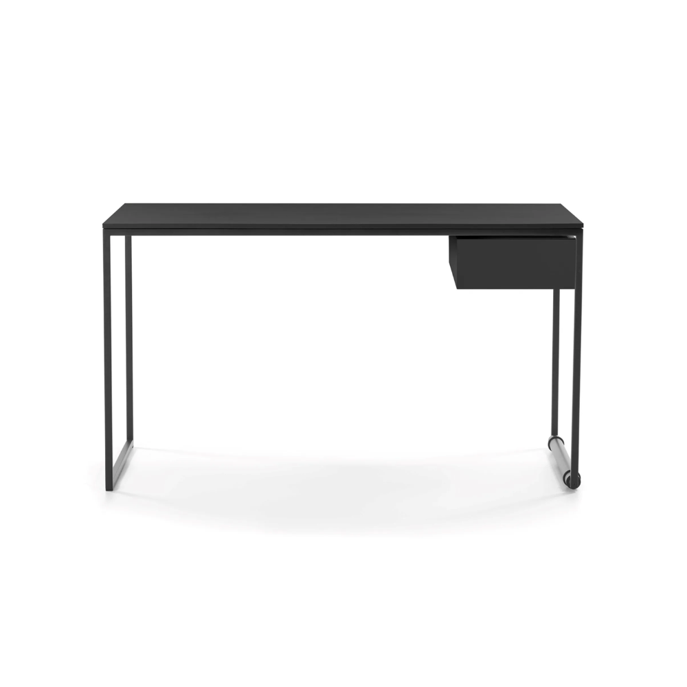 Model Macis nabízí možnost vybavení dalším šuplíkem pod deskou, který umožňuje ukládání praktických doplňků a udržení pořádku na pracovní ploše. Různé varianty provedení – včetně desky z dýhovaného dubu nebo matného PET v bílé či černé barvě – umožňují přizpůsobení nábytku charakteru interiéru. Je to psací stůl, který dokonale spojuje mobilitu s elegancí a moderní funkčností.