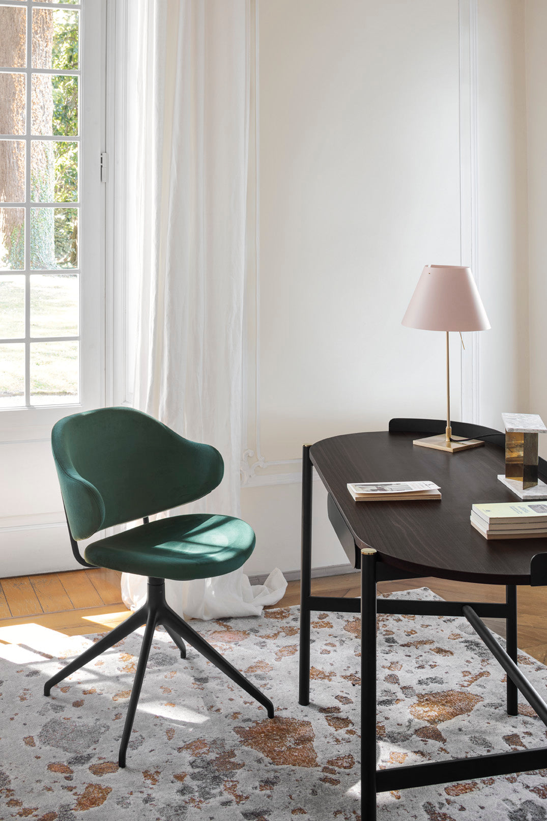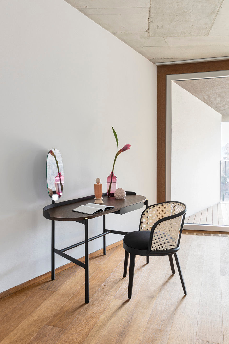Psací stůl Madame je všestranný návrh, navržený s ohledem na různé uživatelské požadavky. Psací stůl spojuje eleganci geometrických linií, a dokonalost oválného tvaru představuje hlavní motiv, což je patrné jak v tvaru desky, tak v zásuvce. Je to ideální volba pro vytvoření stylového pracovního prostoru, který spojuje funkčnost s rafinovaným designem.