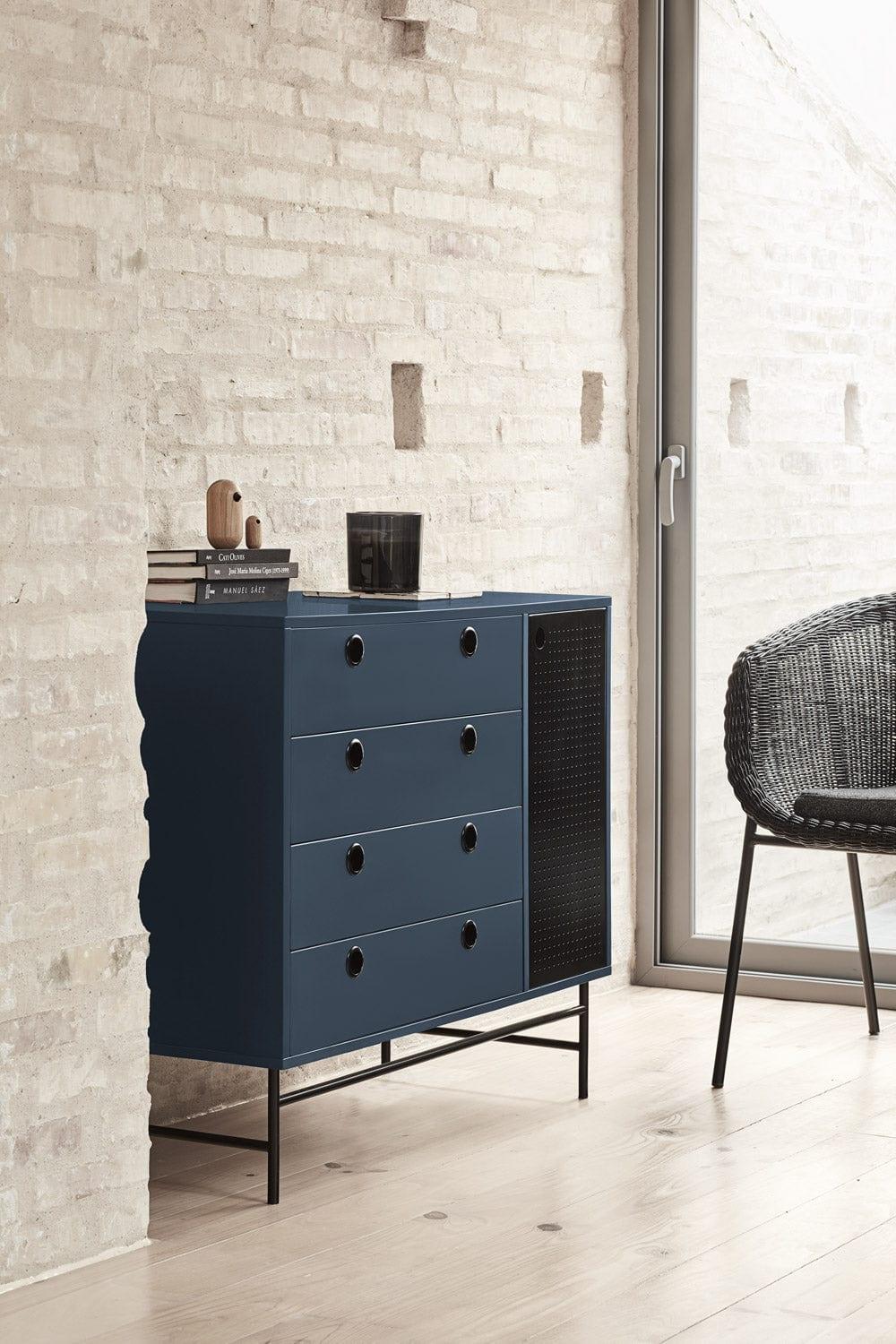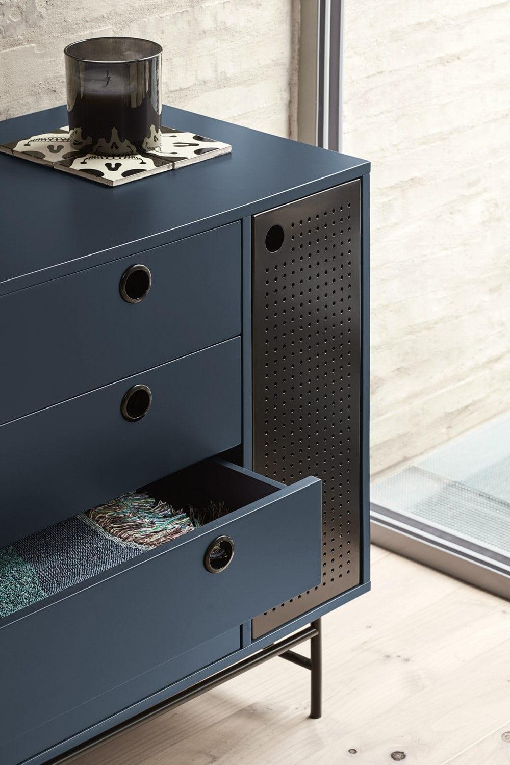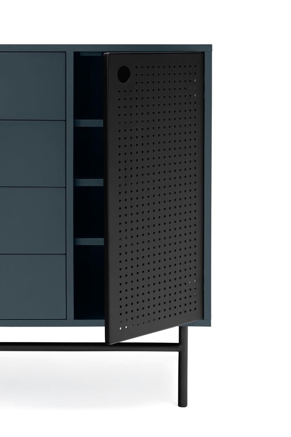 Punto se skvěle hodí také jako skříňka do obývacího pokoje nebo předsíně. Univerzálnost a multifunkčnost jsou jedny z mnoha vlastností, za které si ji zamilujete. Použití tmavě modrého kovu dáváskříňce loftový charakter, který kombinuje útulnost a eleganci.