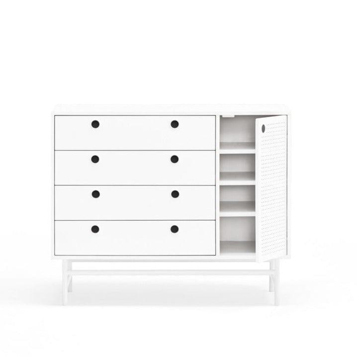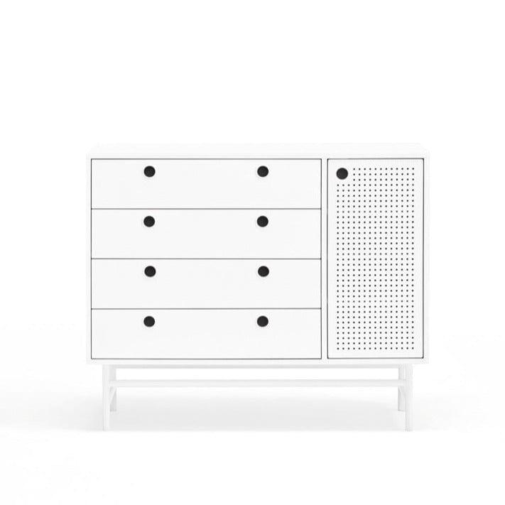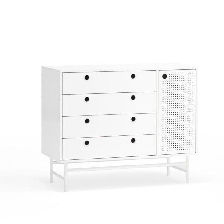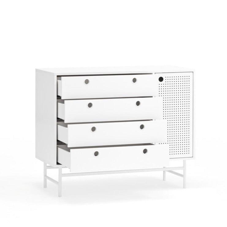 Punto se skvěle hodí také jako skříňka do obývacího pokoje nebo předsíně. Univerzálnost a multifunkčnost jsou jedny z mnoha vlastností, za které si ji zamilujete. Použití bílého kovu dává skříňce loftový charakter, který kombinuje útulnost a eleganci.