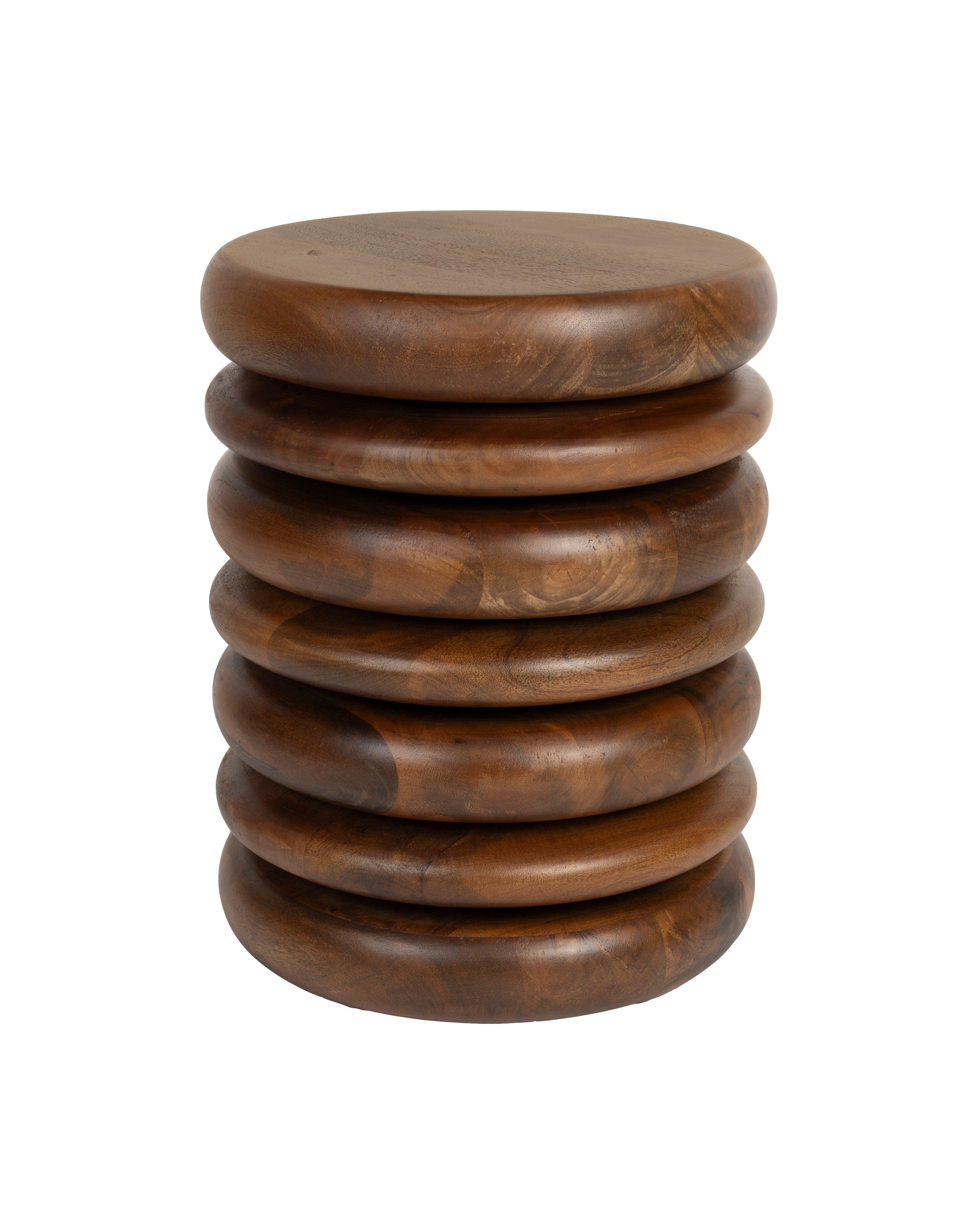 Disc slouží jak jako stylová možnost sezení, tak jako boční stolek. Tenké disky se zajímavě prolínají s tlustšími. Disc je vyroben z mangového dřeva a barvený do bohatého odstínu ořechu.