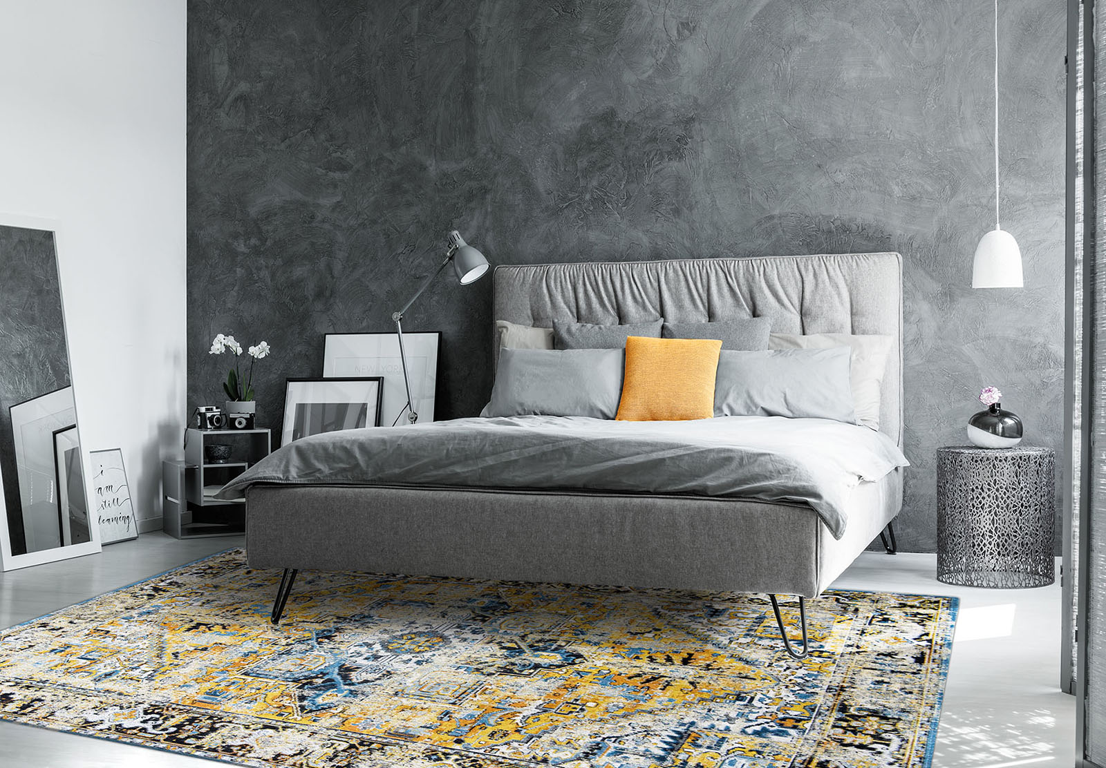 Klasický žluto-modrý koberec vintage Amir Gold vás jistě okouzlí svým jedinečným designem. Tato kolekce, inspirovaná kulturou a estetikou Maroka, přitahuje pozornost bohatou paletou barev a unikátními vzory. Efekty prostorového barvení vytvářejí jemné tonální přechody, které dodávají koberci hloubku, a lehce zkroucená krémová nit přidává vzoru kontrast a eleganci.