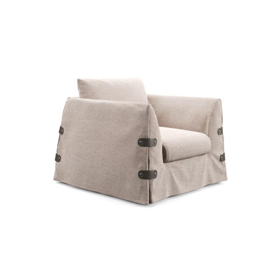 Charakteristickým prvkem tohoto křesla jsou kontrastní pruhy, které jsou definovány knoflíky upevňujícími potah na opěradlech. Tento detail, připomínající martingale pláště, dodává křeslu jedinečný a jasný charakter, který skvěle odráží rozmanitost osobností.