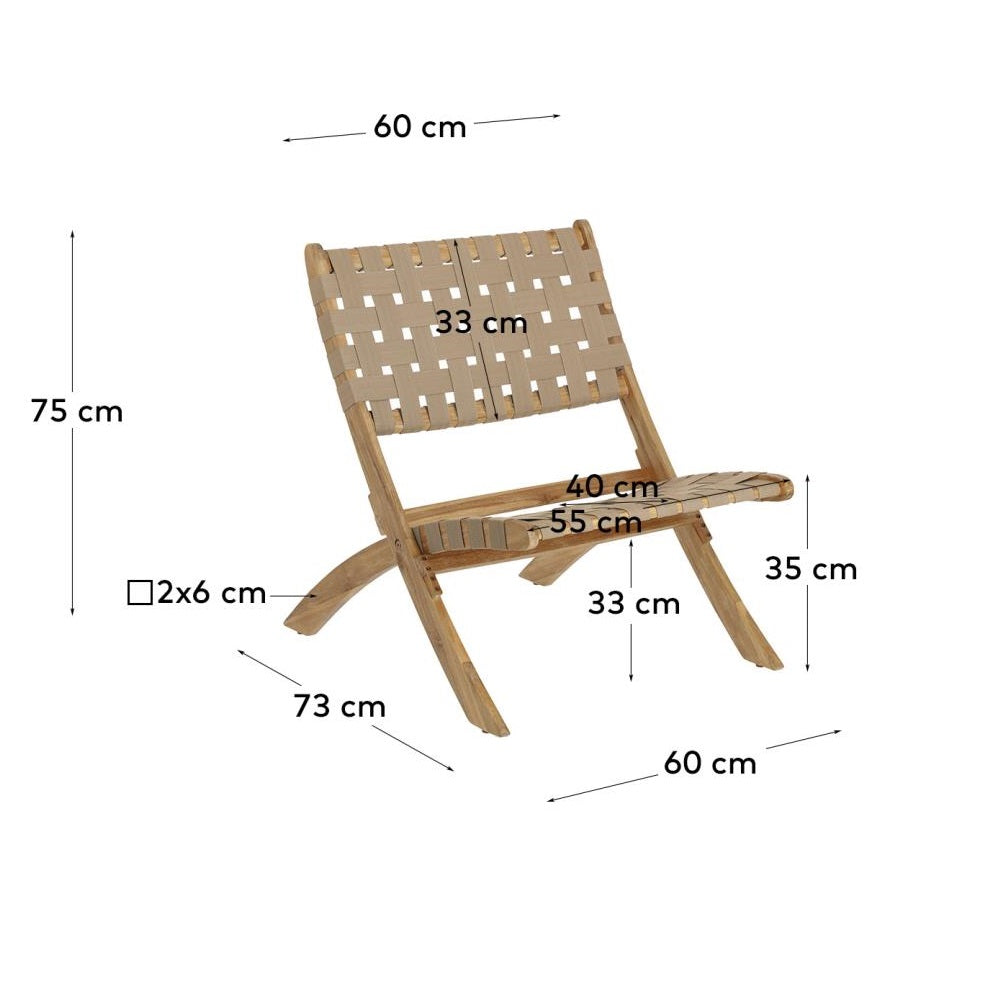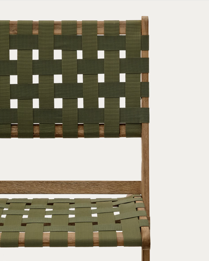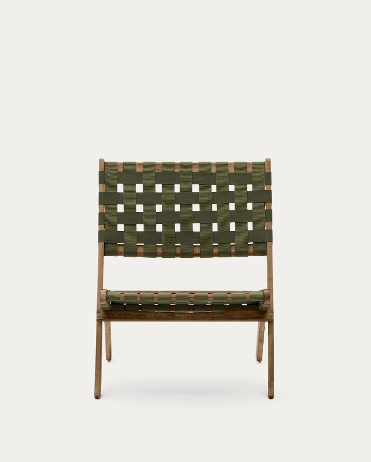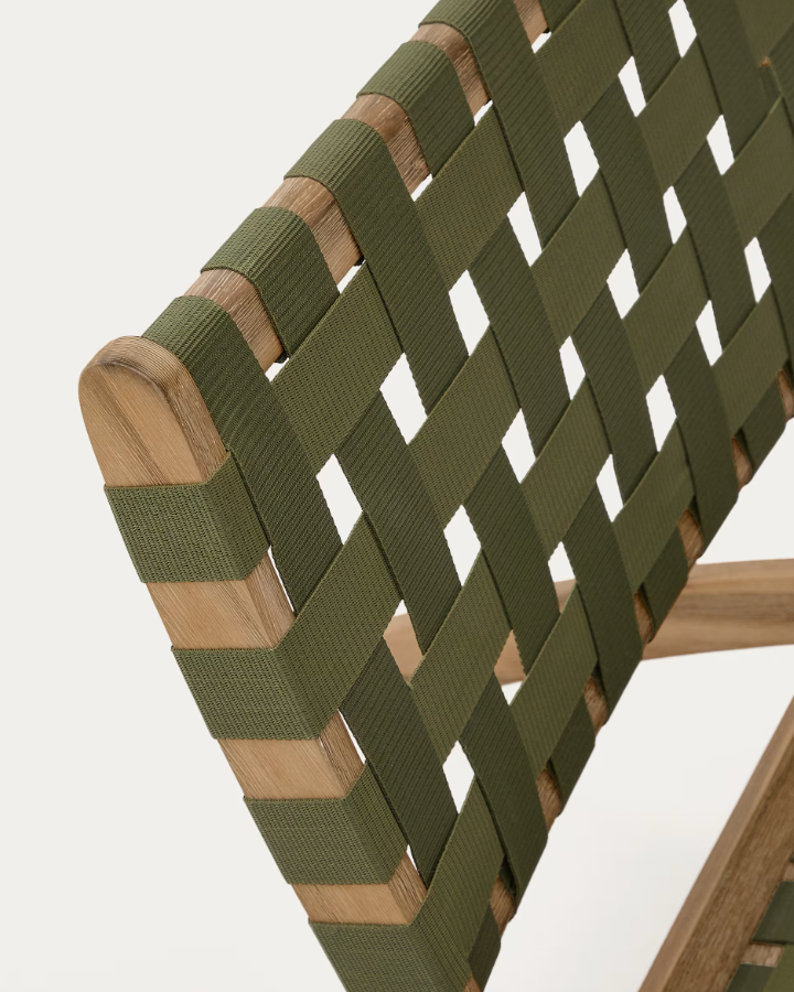 Křeslo Chabeli je ideálním místem pro vychutnávání letních dnů, spojující módní design s bezkonkurenčním komfortem, a poskytující výjimečný zážitek z relaxace na čerstvém vzduchu. Výjimečný design skládacího zahradního křesla Chabeli přitahuje pozornost svou elegancí a stylem. Kombinace ekologického dřeva s ručně pleteným zeleným sedákem nejenže mu dodává jedinečný charakter, ale také zajišťuje trvanlivost a pohodlí při používání. Je to nábytek, který nejen vypadá módně, ale také zve k dlouhým a příjemným chvílím odpočinku.