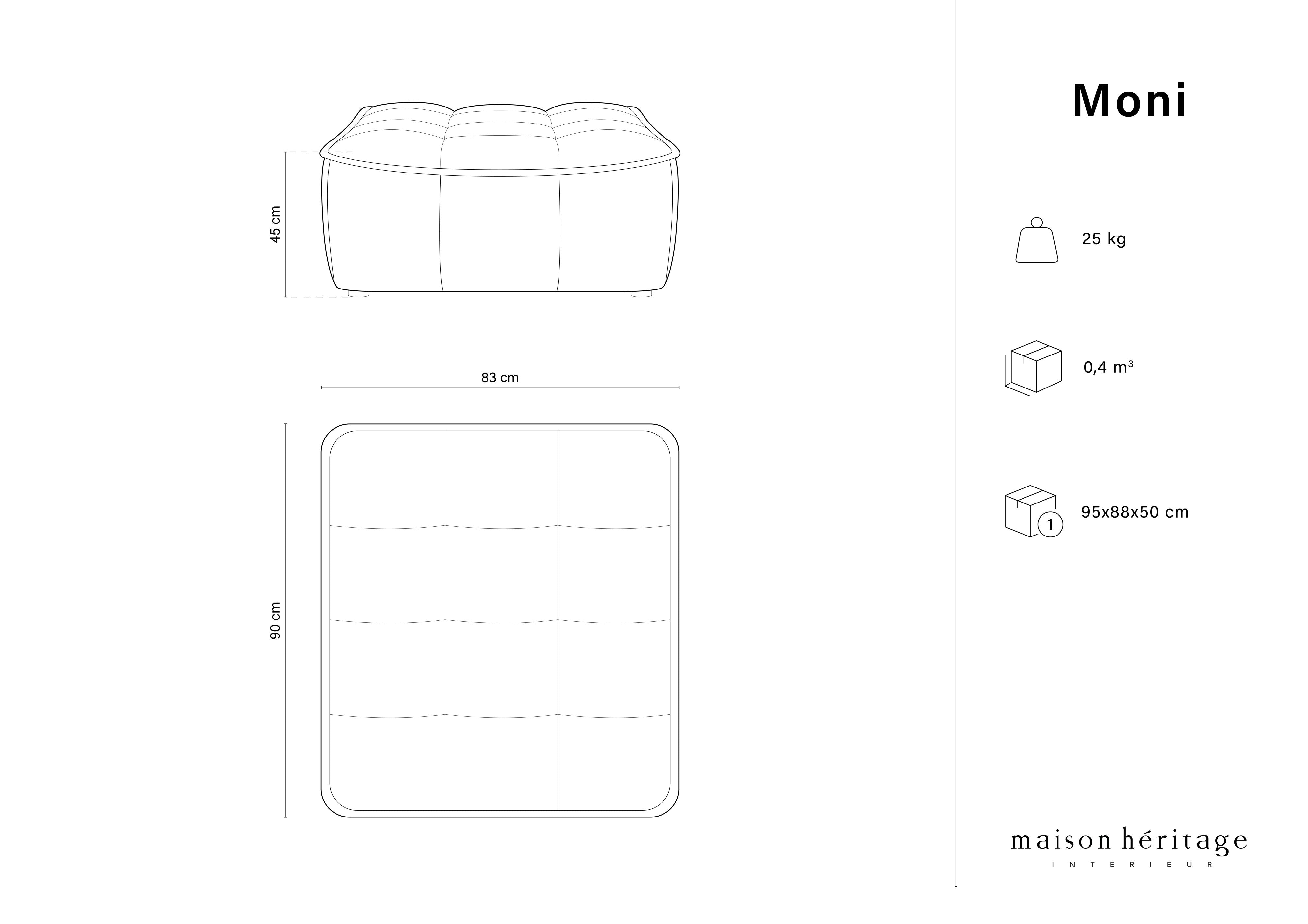 Skórzany puf Moni definuje funkčnost a pohodlí v kombinaci s moderním designem. Stylové prošívání a originální tvar skvěle zapadnou jak do elegantního obývacího pokoje, tak do moderní kanceláře. Čalounění z přírodní hovězí kůže je jemně embosované, díky čemuž je jeho struktura velmi příjemná na dotek. Kolekce Moni zahrnuje několik kombinací pohovek a rohových sedacích souprav, stejně jako prvky jako křesla a lehátka.