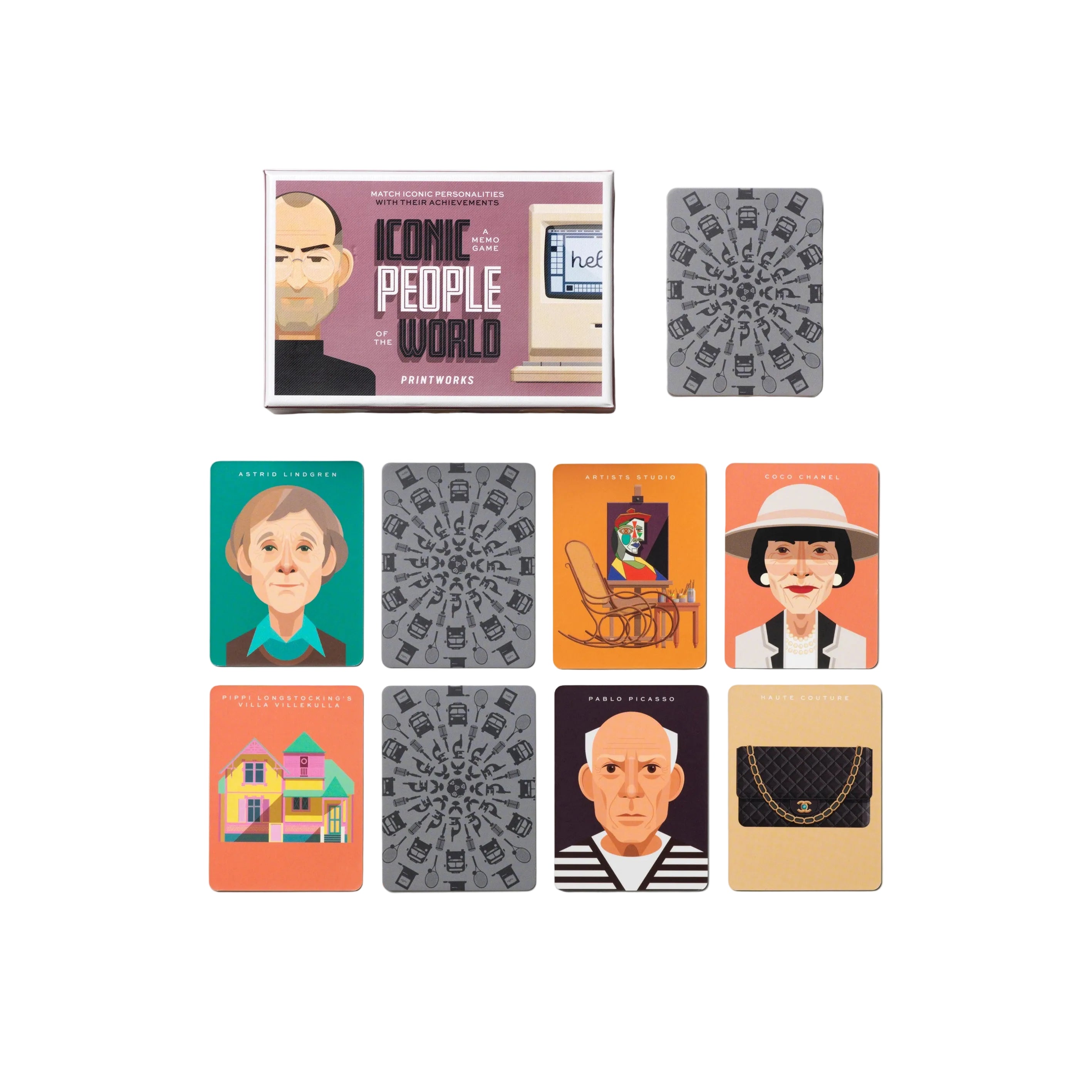 Gra memory Memo Game Iconic People s motivem známých postav je vzdělávací a inspirující zábava, která spojuje hru s poznáváním historie a úspěchů výjimečných osobností. Úkolem hráčů je přiřadit postavy k jejich dosaženým úspěchům, což rozvíjí paměť, pozornost a znalosti o světě. Je to skvělý návrh pro děti i dospělé, kteří se chtějí učit prostřednictvím zábavy.