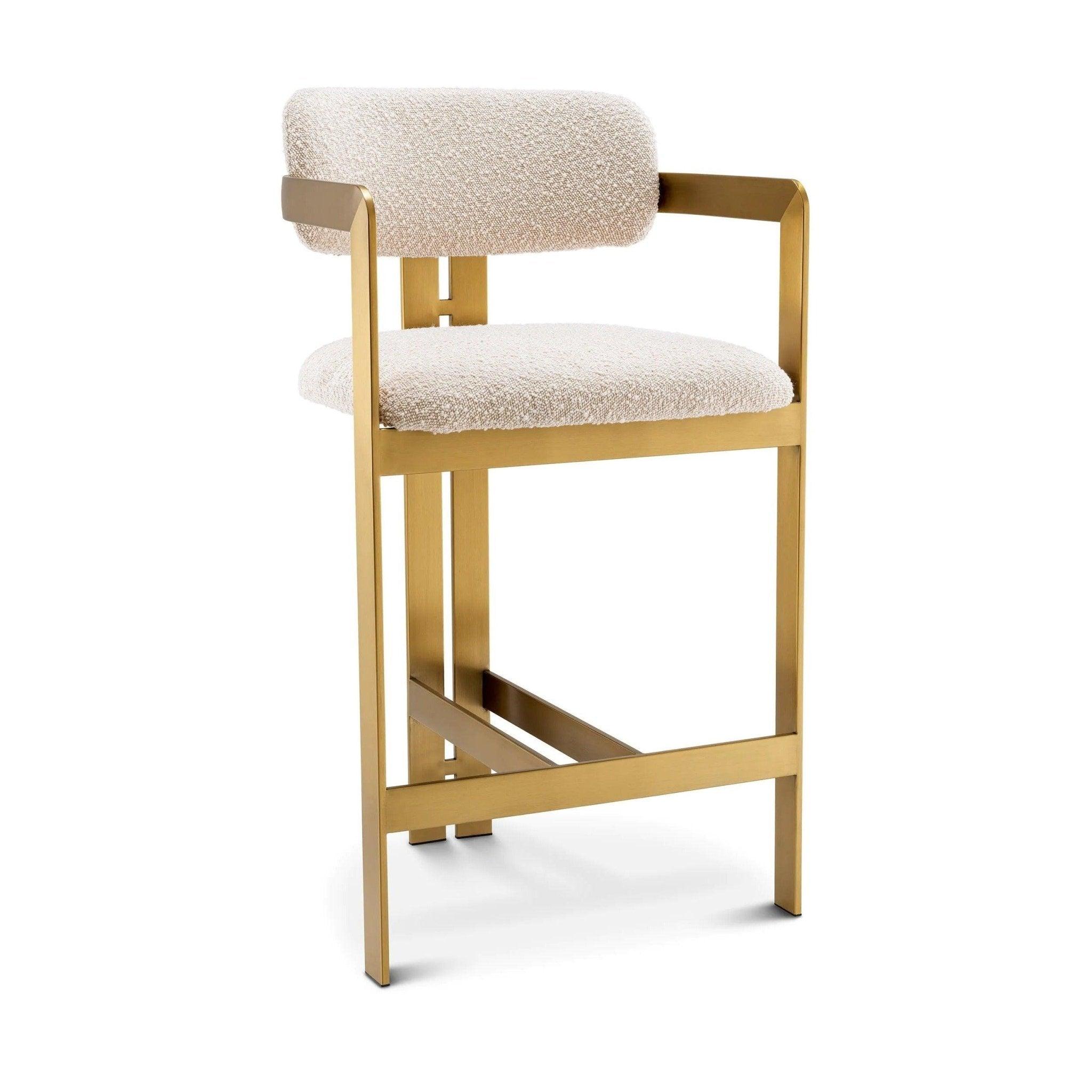 Jeho geometrický rám z kartáčovaného mosazi není jen pevnou konstrukcí, ale také výrazem rafinovaného vkusu. Tvar hokeru je zároveň elegantní a funkční, s kulatým sedákem, který zajišťuje pohodlí, a zakřiveným opěradlem, které mu dodává jedinečný charakter.