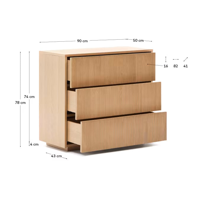 Tři prostorné zásuvky otevírané dotykem, vybavené skrytými, nastavitelnými kolejnicemi, zajišťují pohodlné ukládání. Regulátory na základně vyrovnávají nerovnosti podlahy, zaručující stabilitu nábytku. Komoda ideálně ladí s ostatními prvky kolekce Helvine, vytvářejíc soudržný a funkční prostor.