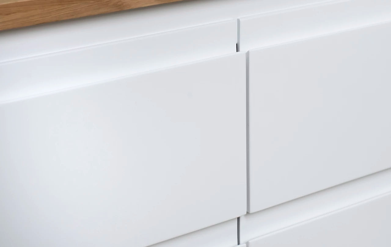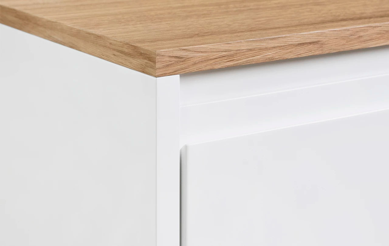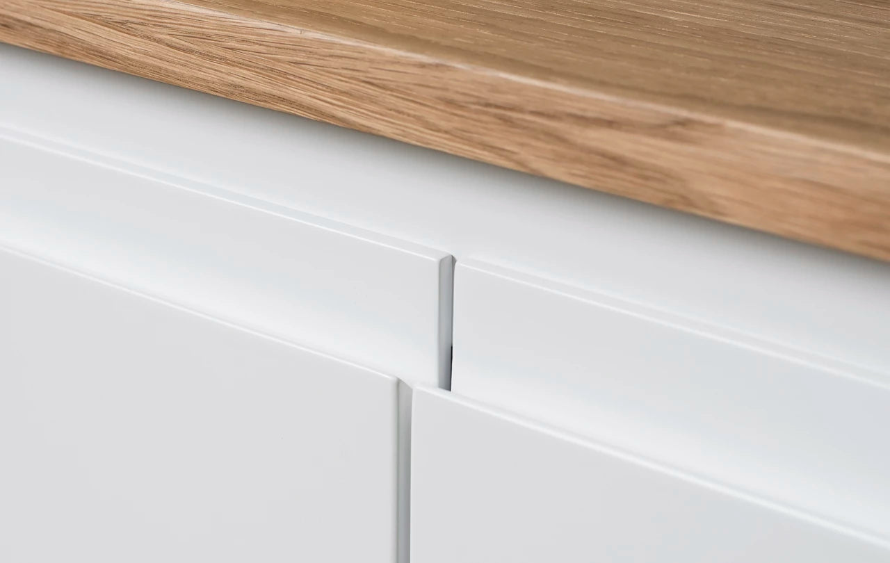 Frézovaná úchytka na čelních stranách designové komody přidává nejen originalitu, ale také usnadňuje otevírání zásuvek. Dále funkce samouzavírání čel zajišťuje, že používání komody je ještě pohodlnější.