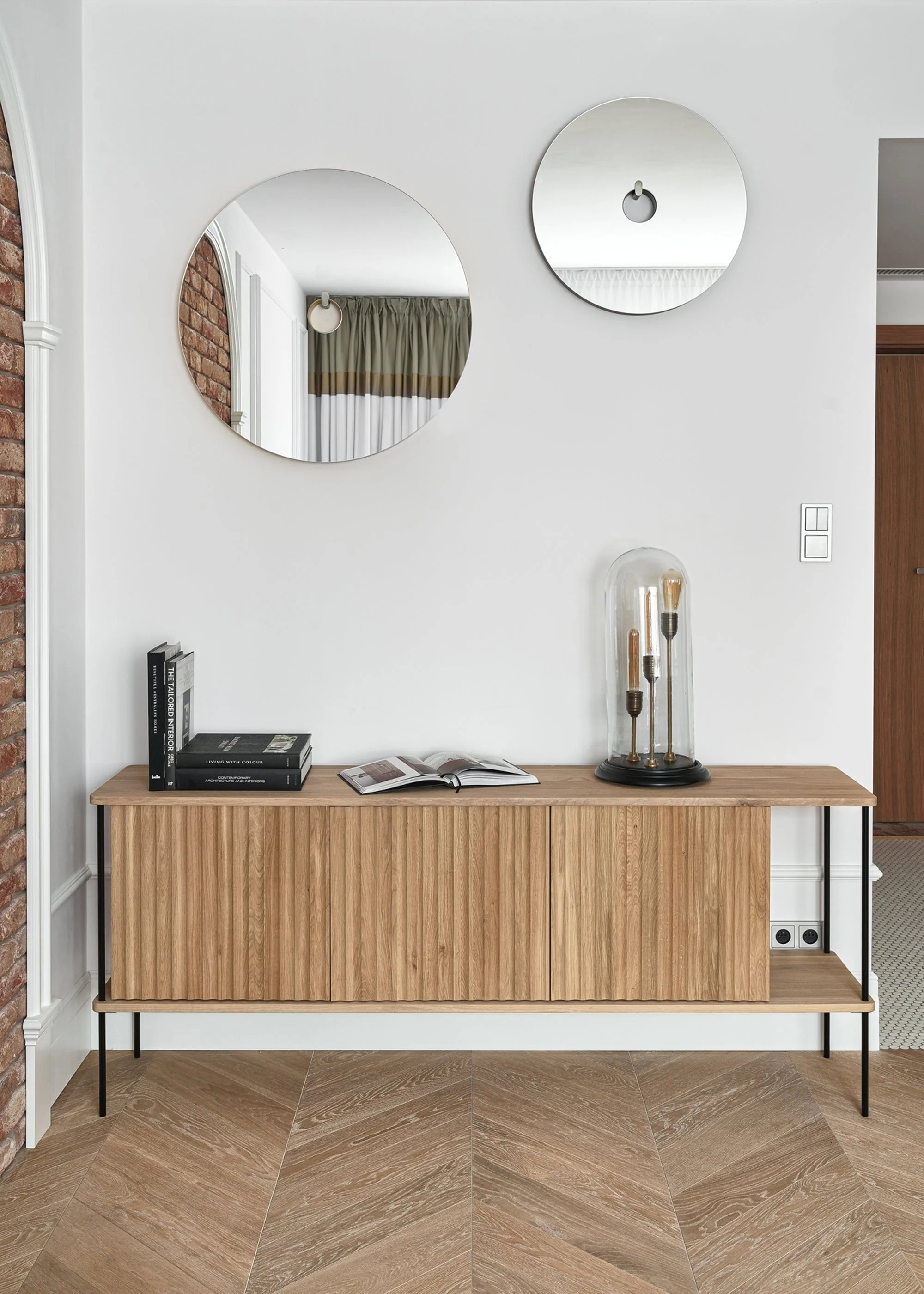 Komoda Maya je výrazný nábytek, jehož vlnitý, rýhovaný čelní panel přitahuje pozornost jako umělecké dílo. Kombinace masivního dřeva a chladné oceli jí dodává moderní, ale přesto teplý charakter, a boční polička dokonale vystavuje gramofon a sbírku vinylů, čímž vytváří funkční a stylovou zónu pro odpočinek.