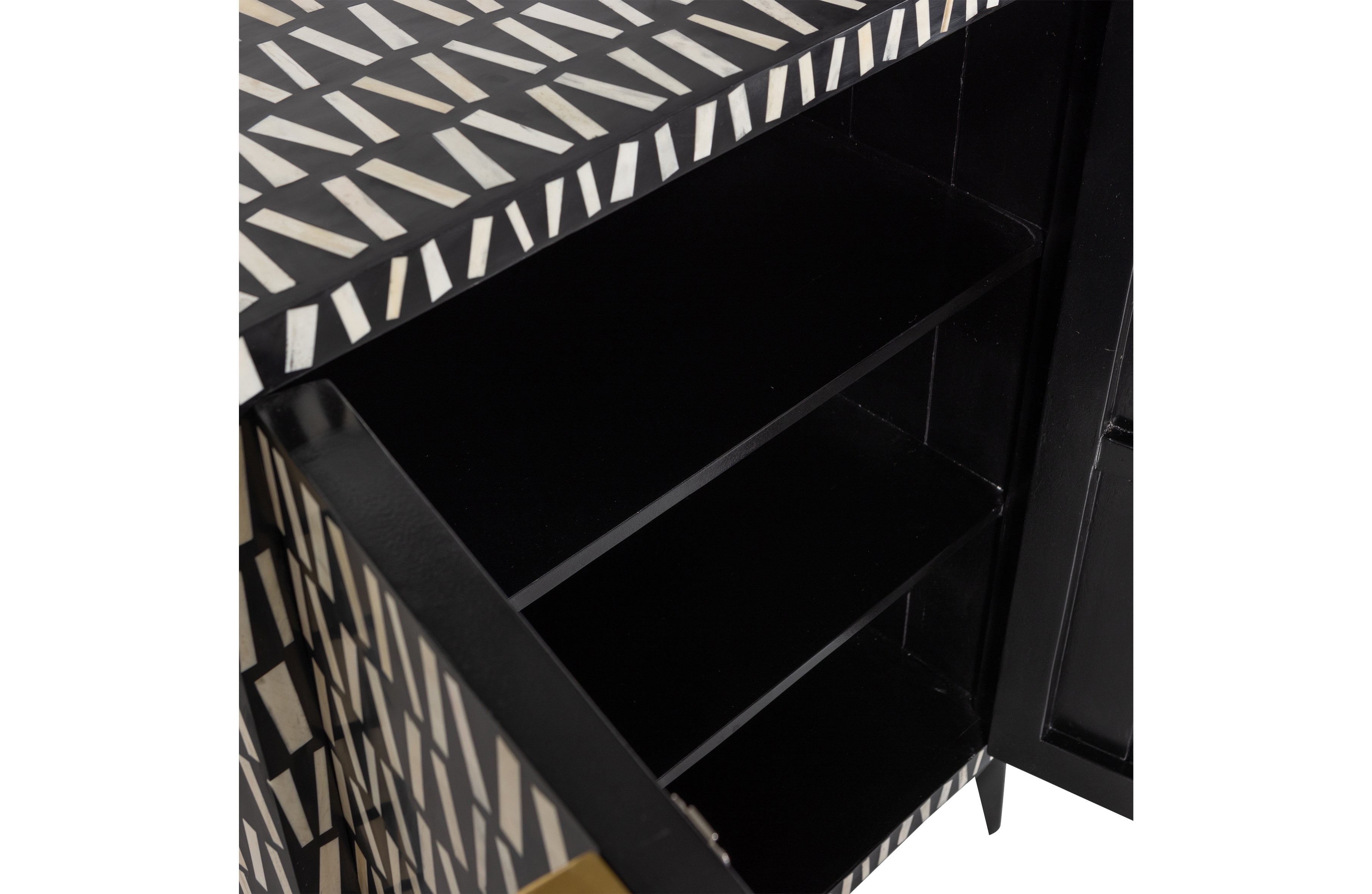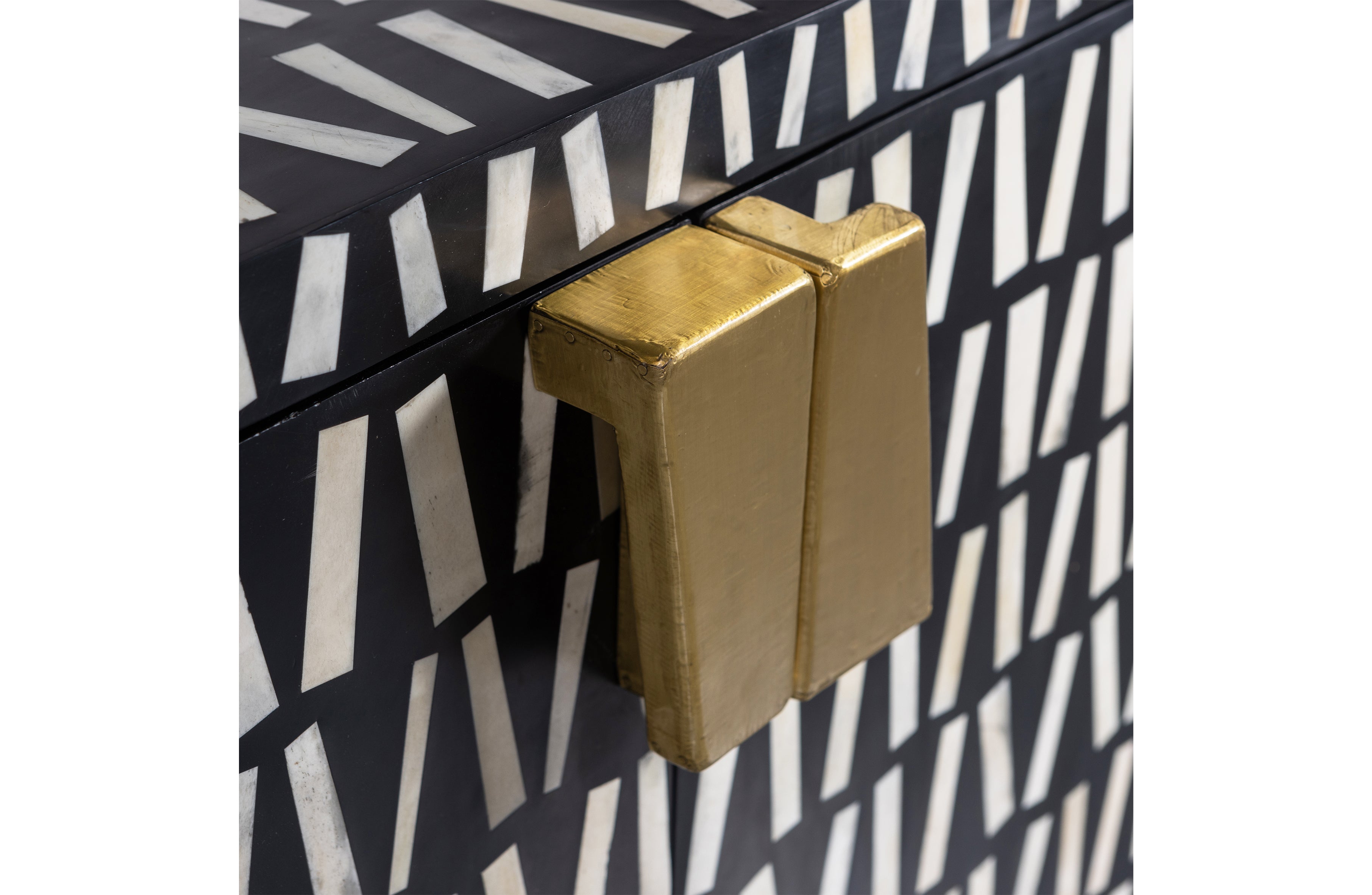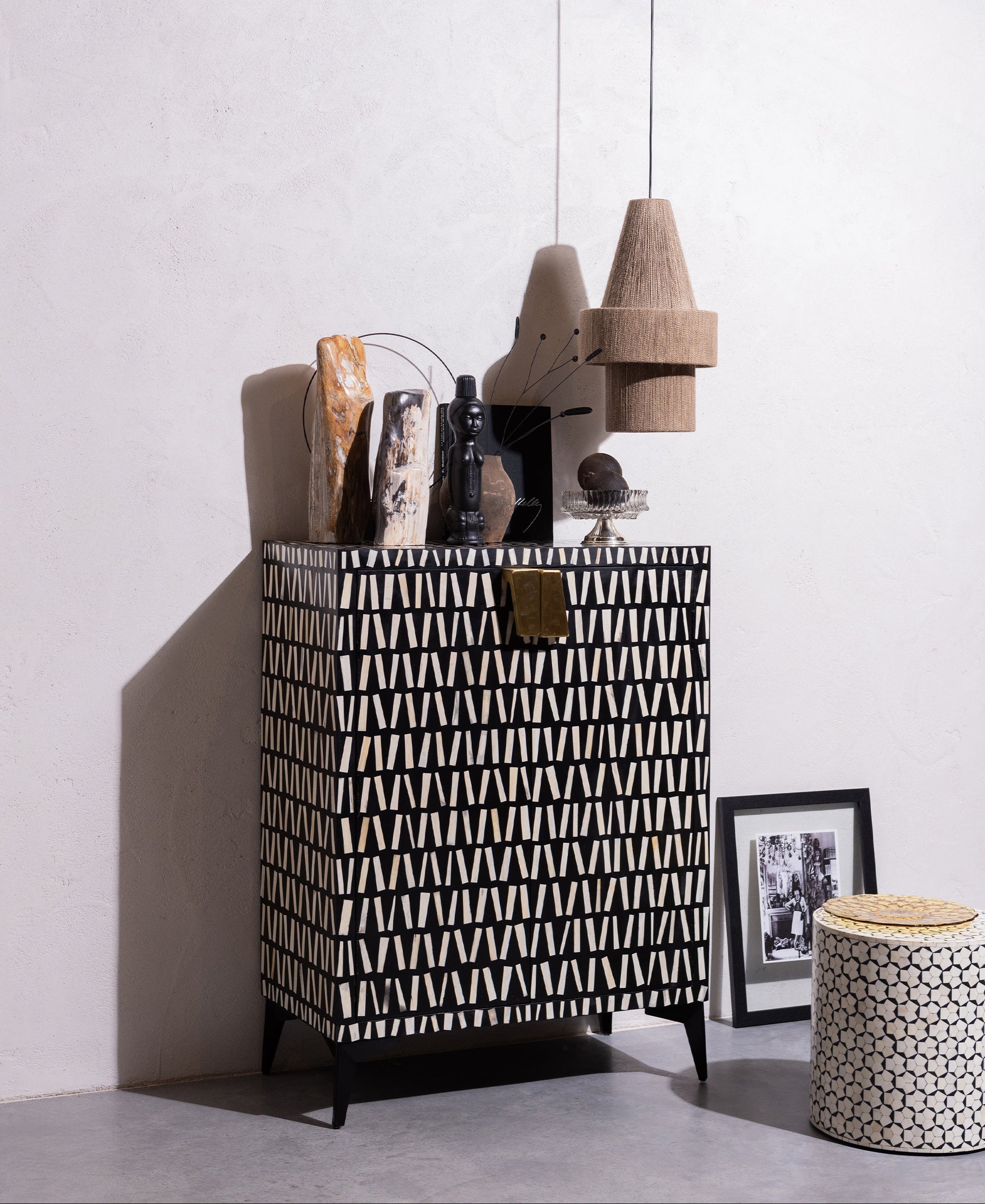 Komoda Menne z drewna mango to wyjątkowy mebel, który natychmiast przyciąga wzrok swoim dekoracyjnym frontem i eleganckim wykończeniem. Designerski charakter podkreśla ręcznie wykonana mozaika z naturalnej kości – surowca pozyskiwanego z odpadów organicznych, co czyni go zarówno estetycznym, jak i świadomym wyborem. Czarne matowe drewno mango nadaje całości głębi i charakteru, a smukła metalowa podstawa dodaje lekkości. Menne oferuje nie tylko styl, ale i praktyczność – w środku znajduje się mnóstwo miejsca do przechowywania najpotrzebniejszych rzeczy.