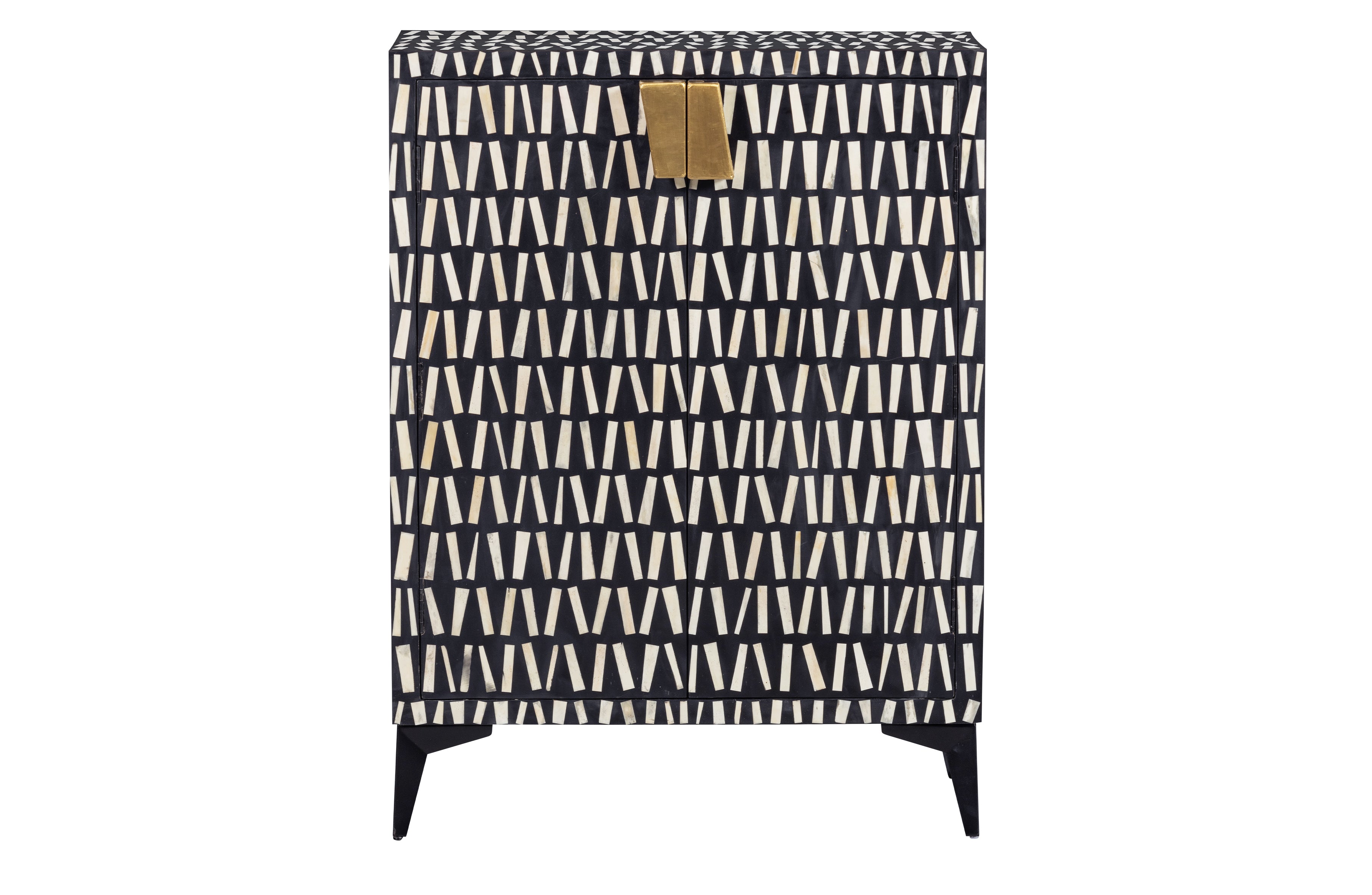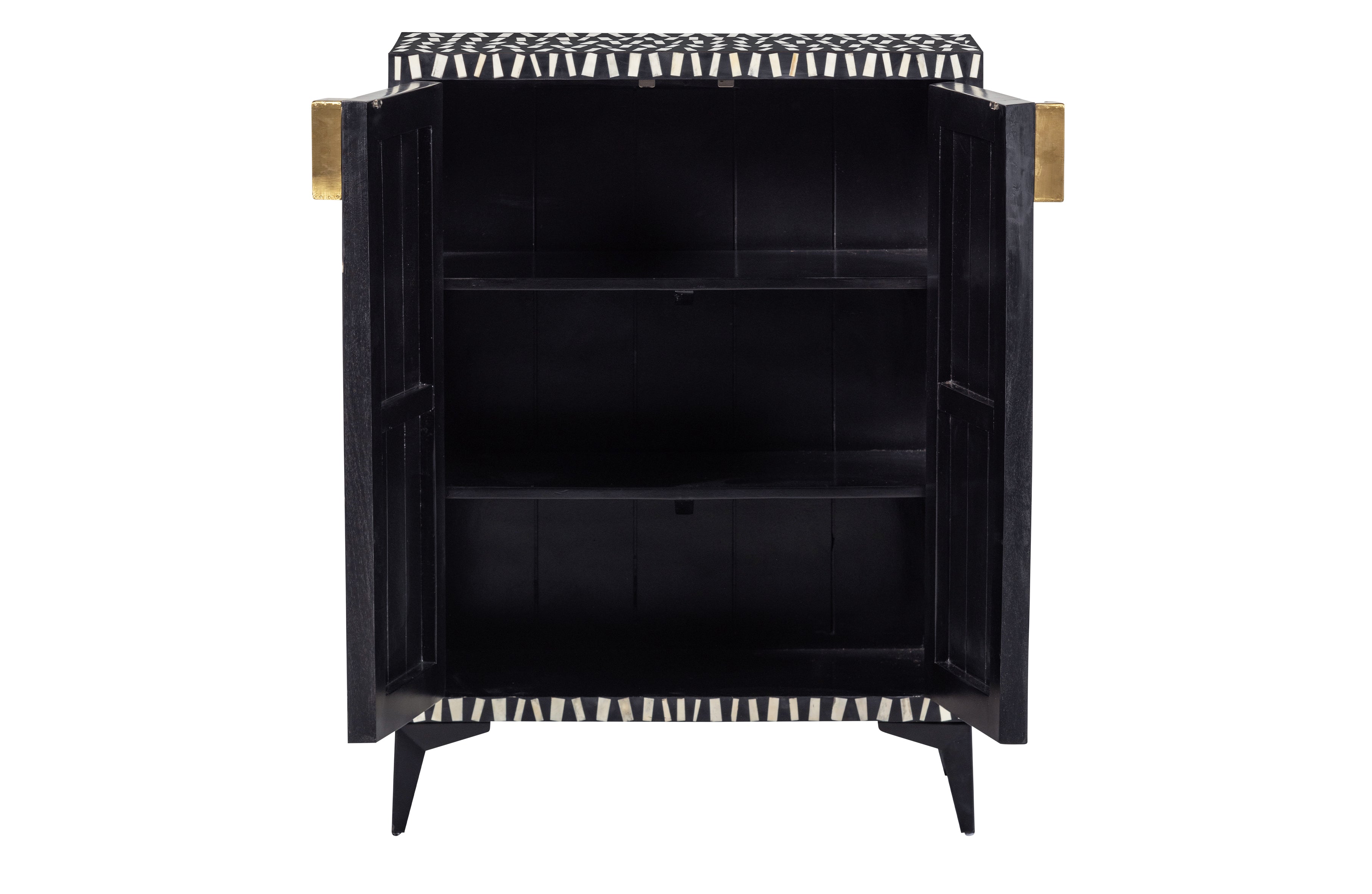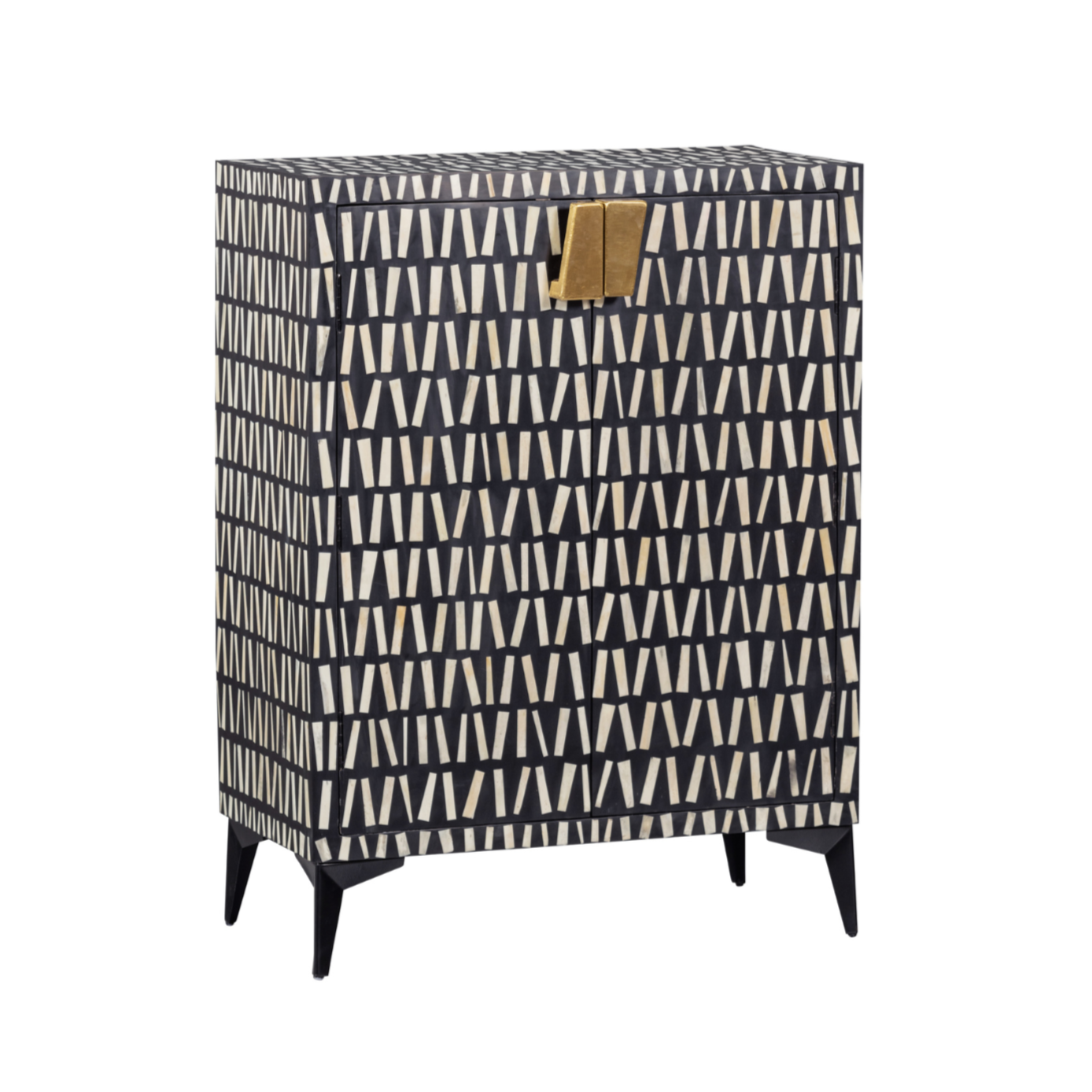 Komoda Menne z drewna mango to wyjątkowy mebel, który natychmiast przyciąga wzrok swoim dekoracyjnym frontem i eleganckim wykończeniem. Designerski charakter podkreśla ręcznie wykonana mozaika z naturalnej kości – surowca pozyskiwanego z odpadów organicznych, co czyni go zarówno estetycznym, jak i świadomym wyborem. Czarne matowe drewno mango nadaje całości głębi i charakteru, a smukła metalowa podstawa dodaje lekkości. Menne oferuje nie tylko styl, ale i praktyczność – w środku znajduje się mnóstwo miejsca do przechowywania najpotrzebniejszych rzeczy.