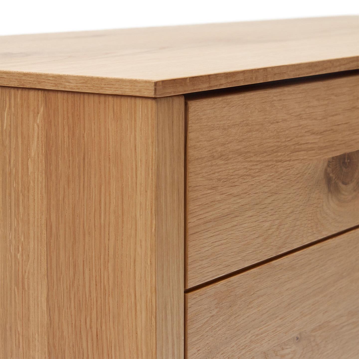 Komoda se zásuvkami Alguema, vytvořená renomovaným designérským týmem Kave Home, představuje jedinečný návrh pro ty, kteří hledají klid a relaxaci ve svých interiérech. Kombinace minimalistického stylu s rafinovanou dubovou dýhou v přírodním provedení činí tuto kolekci nejen funkční, ale i esteticky ohromující.
