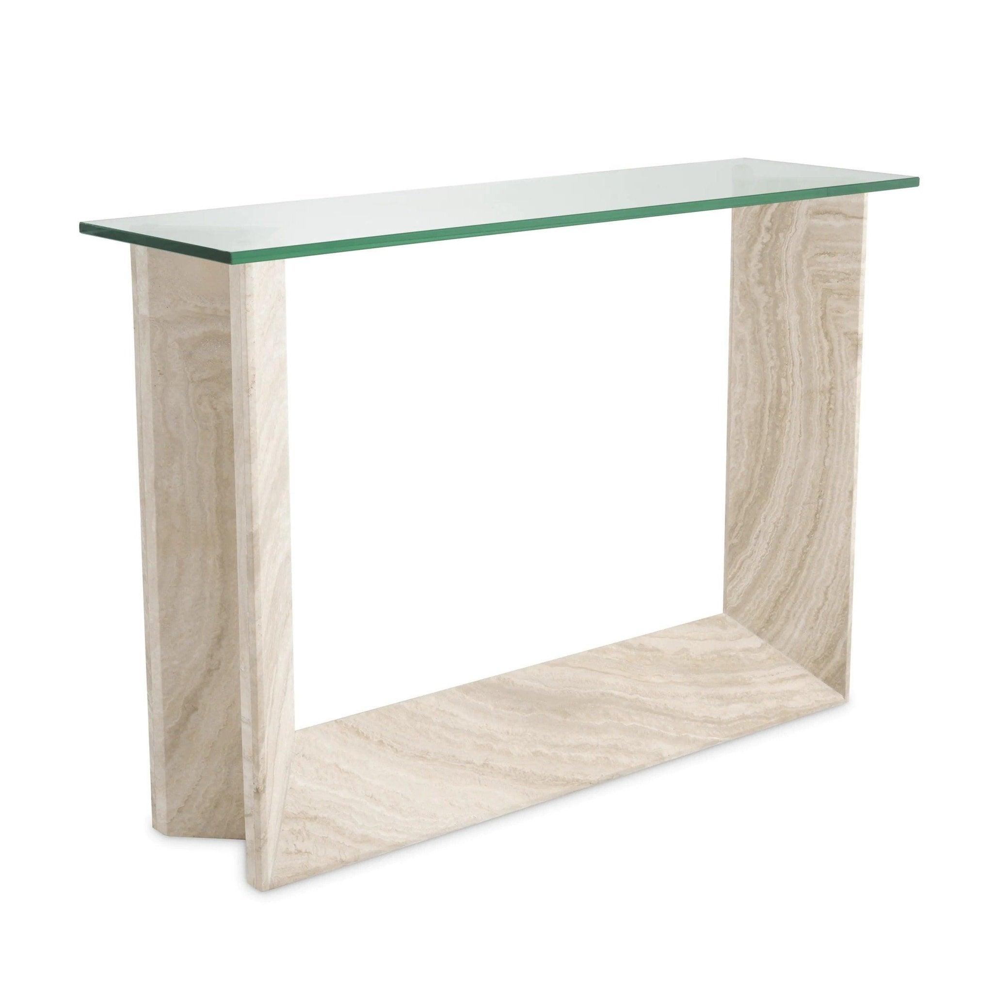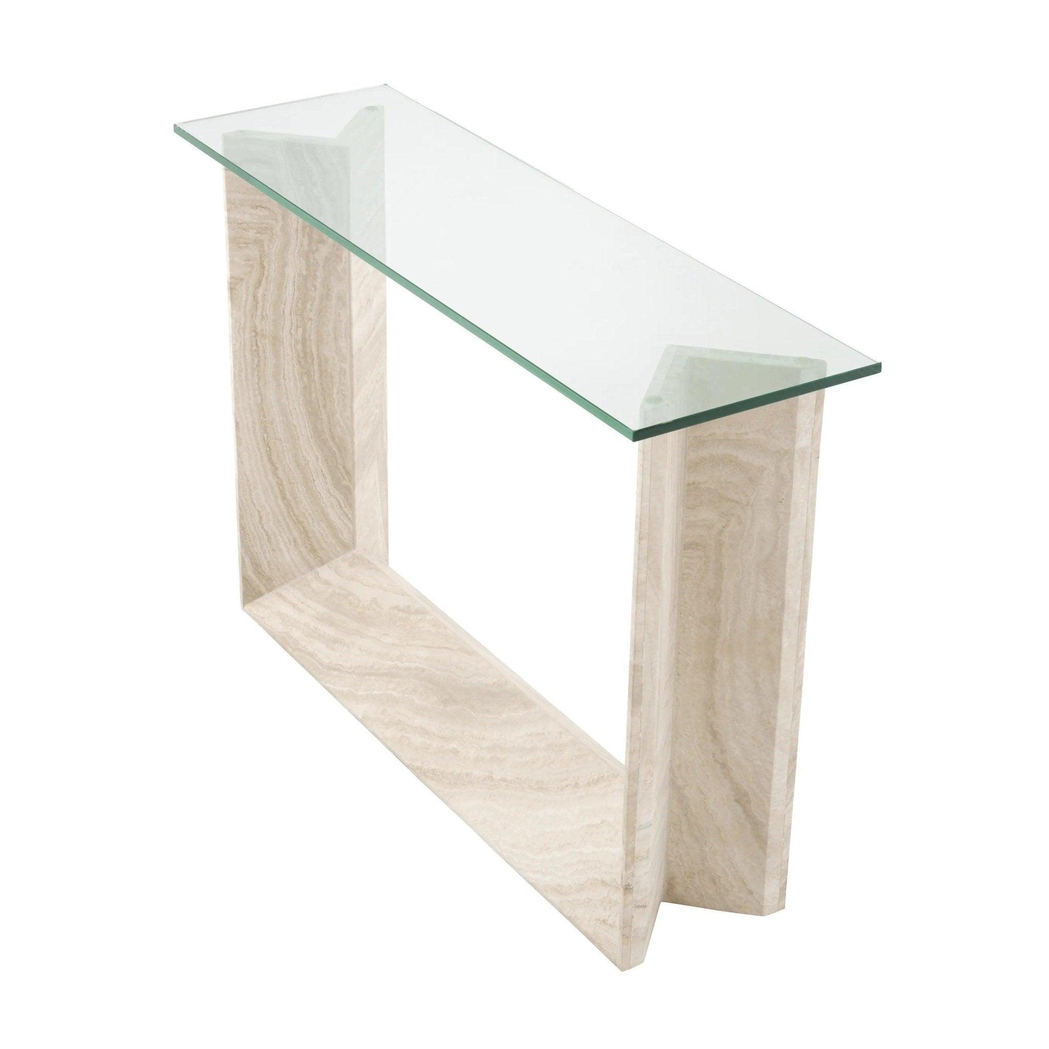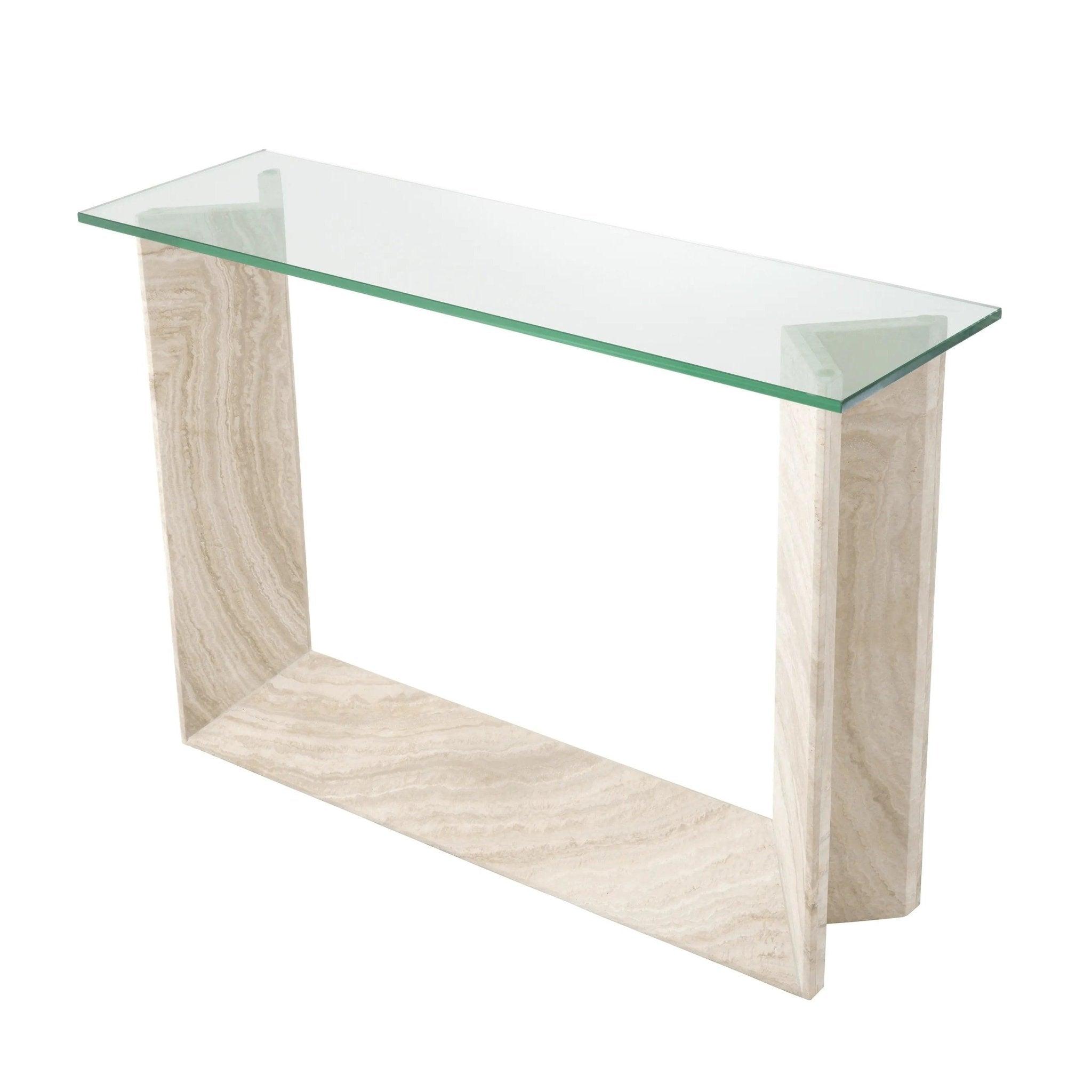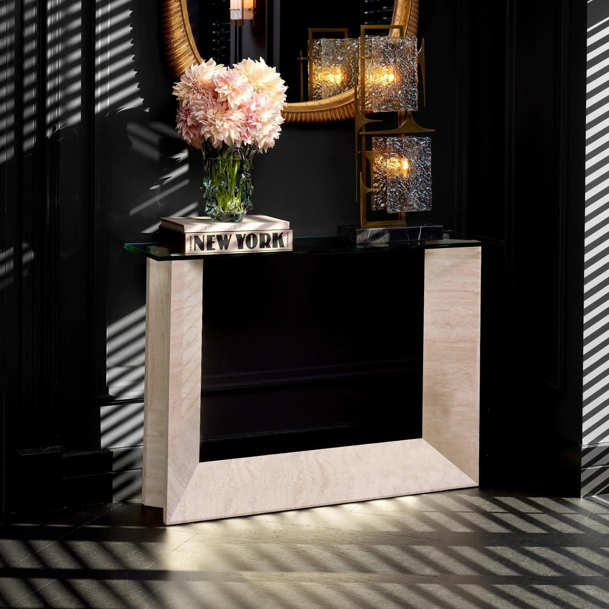 Každý kus travertinu použitý k výrobě této světlé konzole je ručně vybírán, aby zajistil jedinečný charakter a přirozenou krásu. Je to materiál, který čerpá inspiraci z přírody a přetváří ji v jedinečné umělecké dílo. Organické textury travertinu dodávají nábytku unikátnost a nezaměnitelný půvab. Průhledná obdélníková skleněná deska není jen praktickým prvkem, ale také kontrastním designovým prvkem. Přidává trochu lesku a rafinovanosti, což vytváří ohromující vizuální efekt v kombinaci s travertinem.