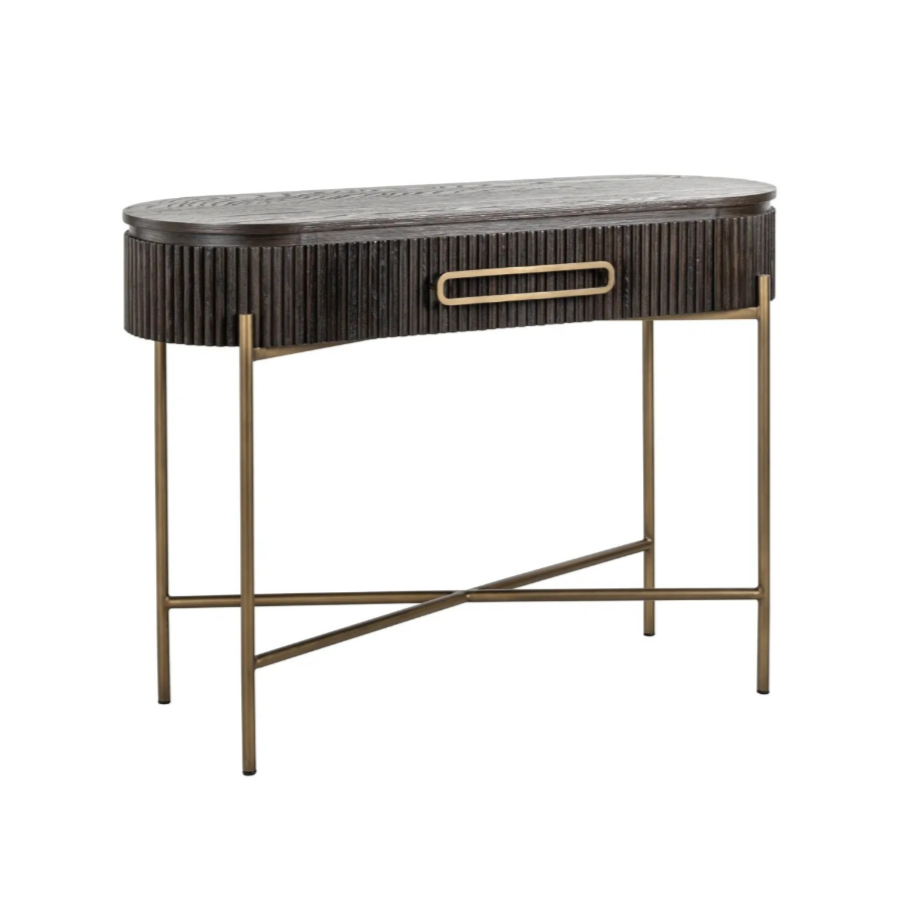 Elegantní konzole Luxor s zaoblenou deskou a rýhovaným čelem je nábytek, který do interiéru vnáší nádech moderního glamour stylu. Tmavé dřevo dýhované dubem krásně kontrastuje s štíhlým podstavcem z kovu v barvě patinovaného zlata, čímž vytváří vyvážený a luxusní celek. Jemná úchytka a asymetrický tvar desky dodávají celku lehkost a originální charakter.