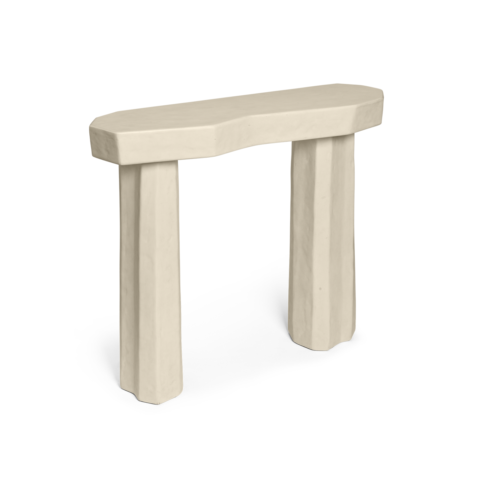 Konsola Staffa to wyjątkowy mebel, inspirowany wulkanicznymi formacjami skalnymi z wyspy Staffa w Szkocji. Jej nazwa, oznaczająca „filar” w staronordyckim, odzwierciedla solidny, monumentalny charakter tego projektu. Wykonana z betonu zbrojonego włóknem szklanym, konsola łączy innowacyjną technologię z surową estetyką. Proces odlewania nadaje jej powierzchni niejednorodną fakturę, która przypomina ręcznie rzeźbiony kamień, nadając każdemu egzemplarzowi niepowtarzalny wygląd.