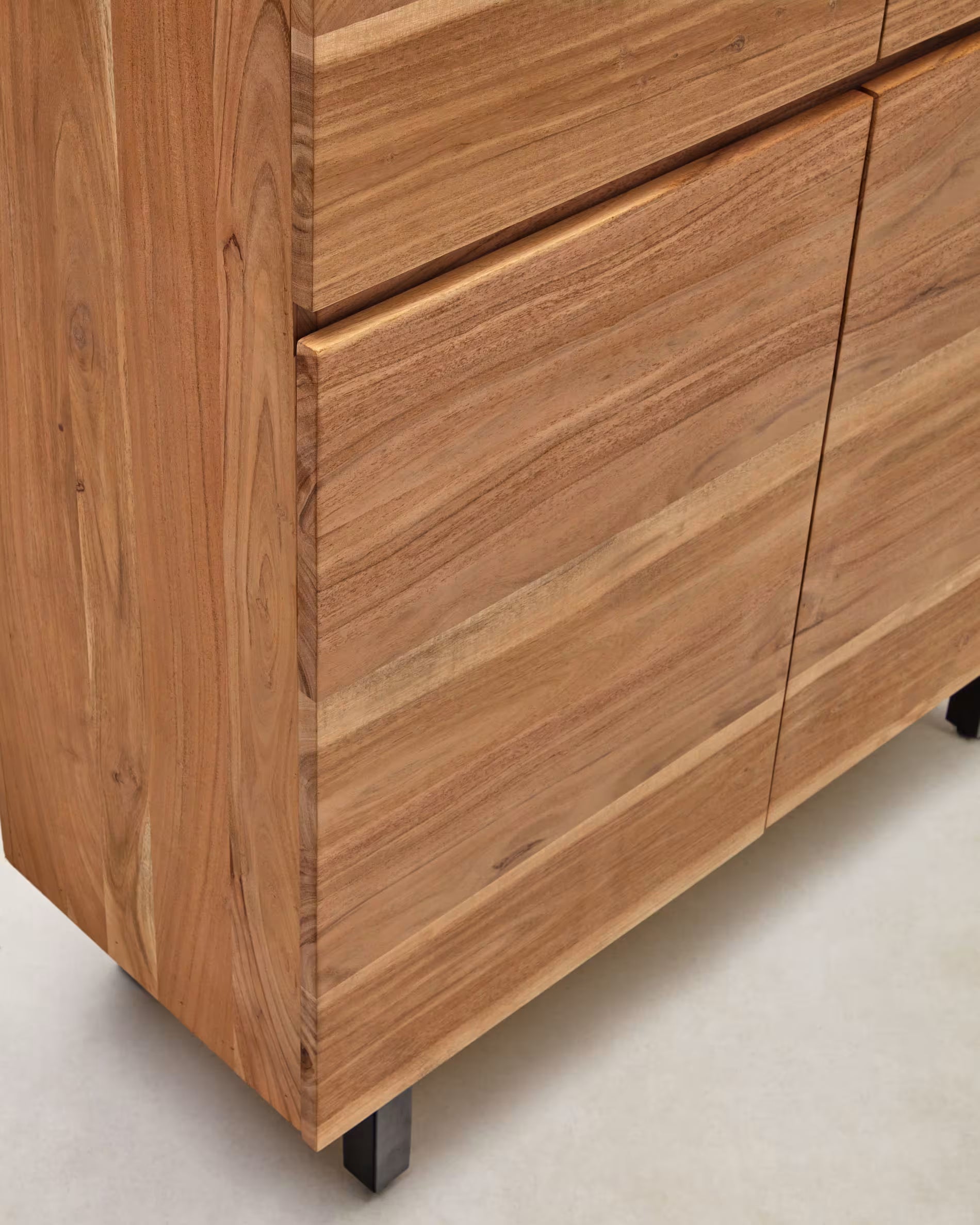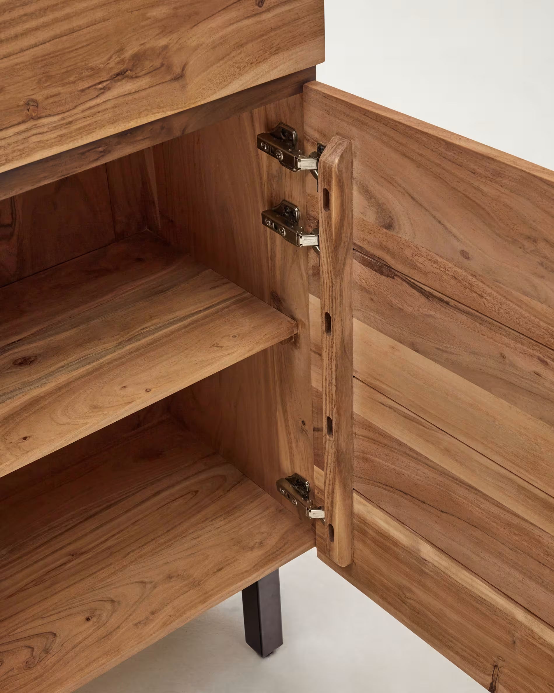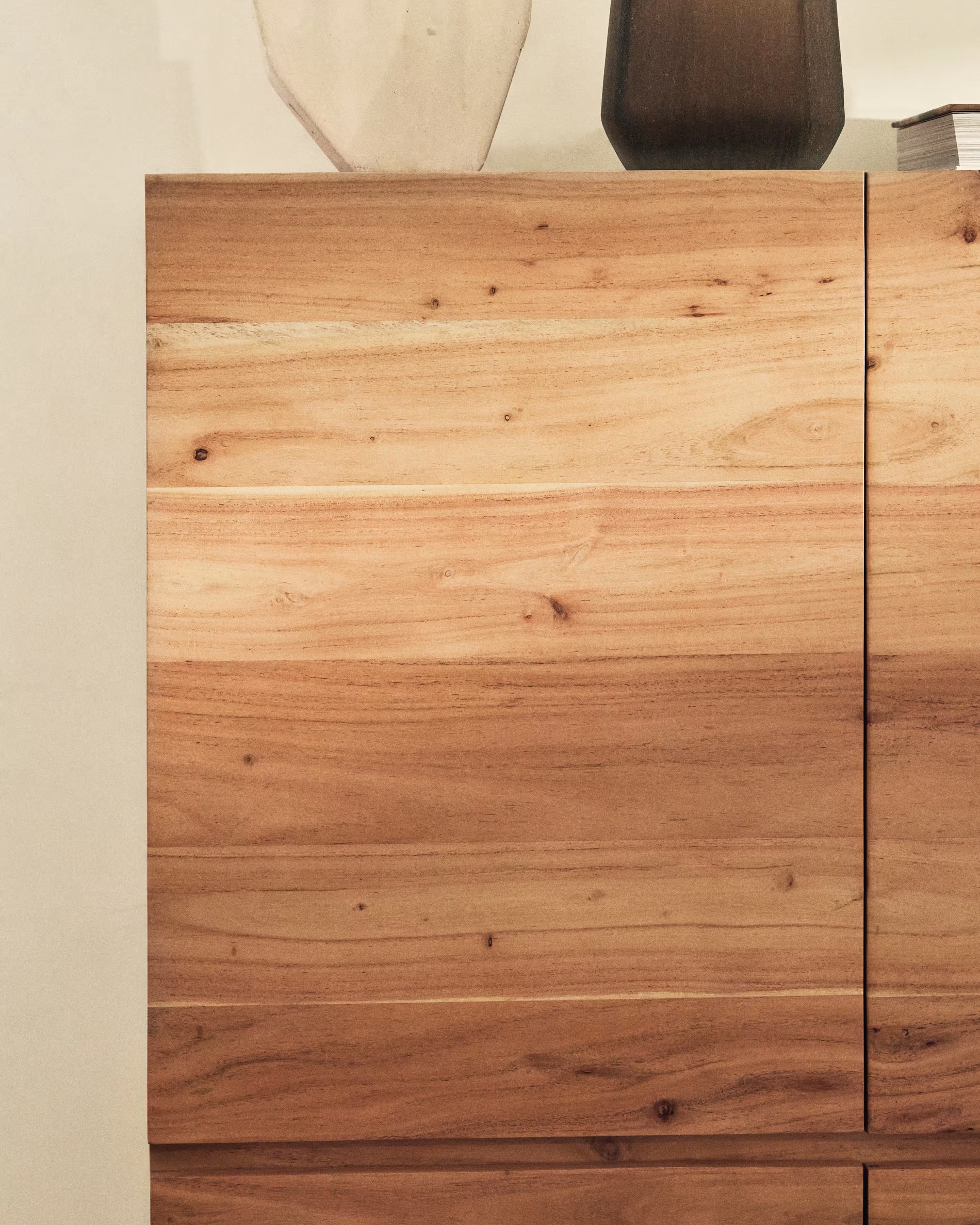 Ten wyjątkowy kredens z kolekcji Uxue to połączenie ponadczasowej elegancji i praktyczności, które doskonale wpisze się w każde wnętrze. Wykonany z litego drewna akacjowego z bielonym wykończeniem, zachwyca naturalnym usłojeniem i ciepłym charakterem, nadając przestrzeni jasności i wyjątkowego uroku. Subtelne, zintegrowane drzwi podkreślają minimalistyczny design, dzięki czemu mebel idealnie komponuje się zarówno z nowoczesnymi, jak i klasycznymi aranżacjami.