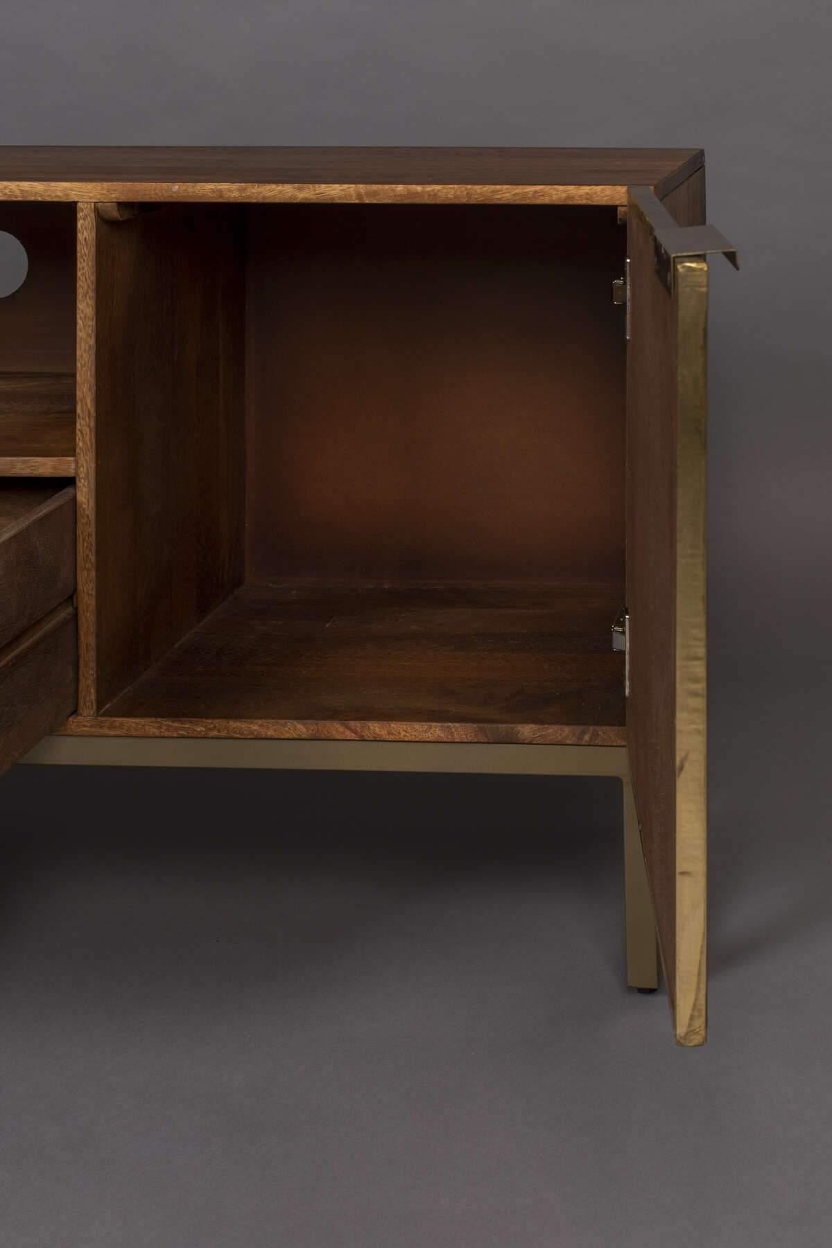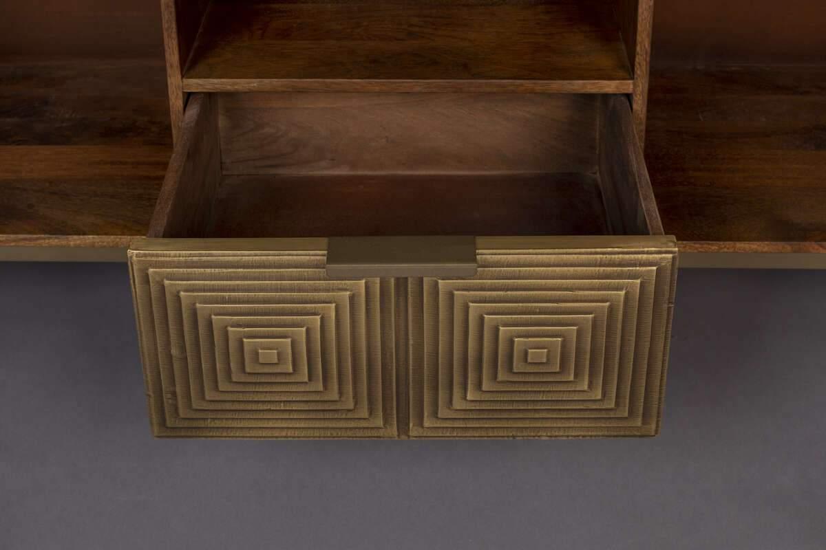 Volan je designový kredenc vyrobený z masivního mangového dřeva v medovém odstínu. Kredenc Volan se vyznačuje originálním tvarem a stylovým provedením. Mosazné doplňky dodávají kredenci antický charakter, zatímco celkový vzhled doplňuje stylový stylový, železný rám, který projektu dodává šarm a eleganci.