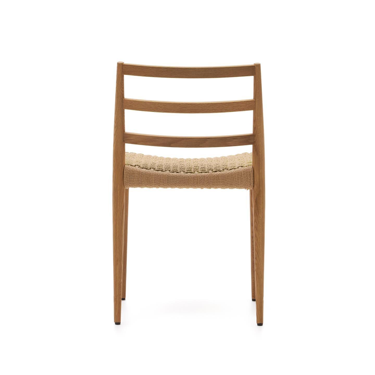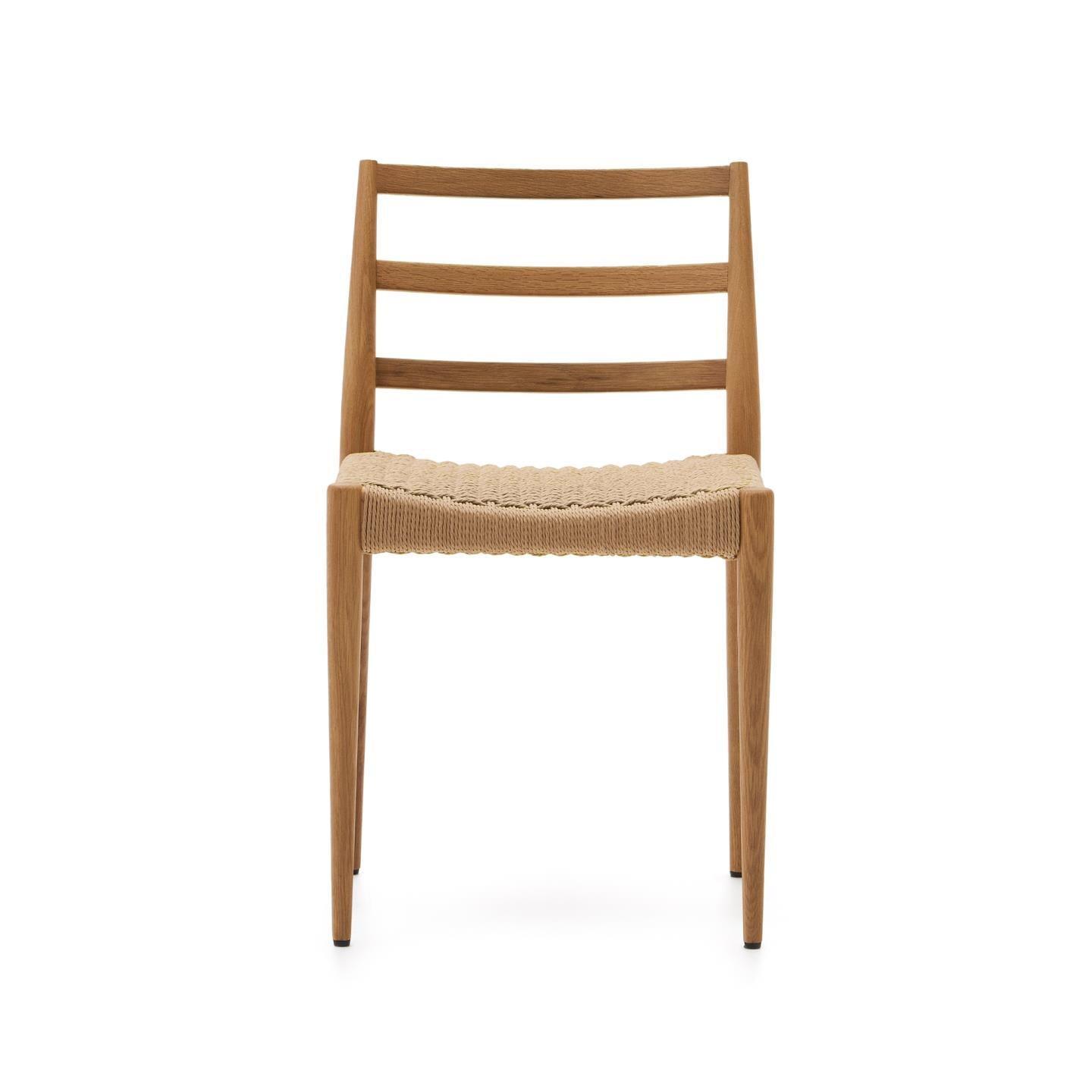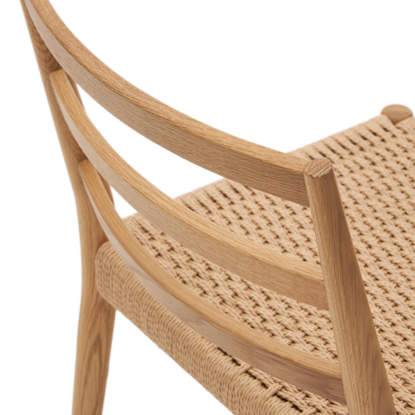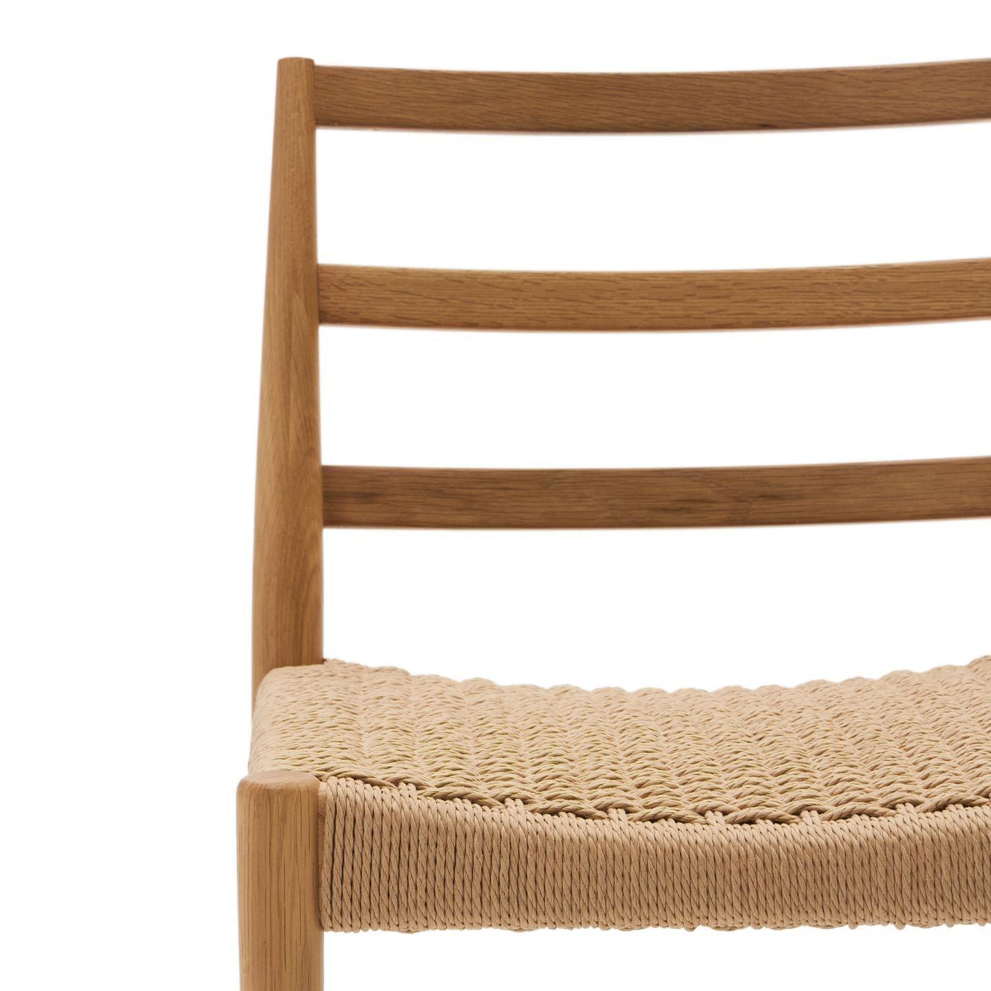Sedák designerské židle byl vyroben z papírového lana, které bylo ručně spleteno, což dodává nábytku jedinečný charakter a jemné provedení. Tato kombinace dubového dřeva a papírového lana činí židli nejen elegantní, ale také trvanlivou a funkční.