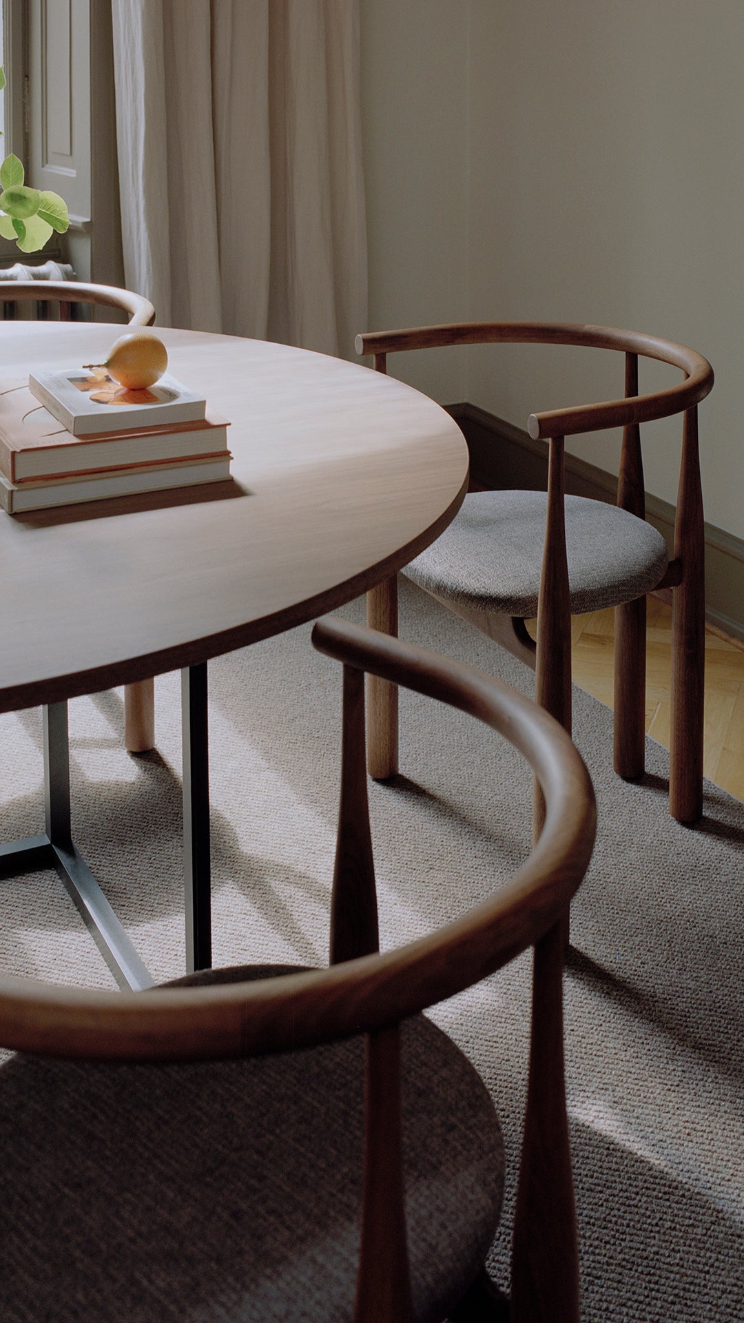 Plynulé přechody mezi štíhlými a robustními prvky dřevěné konstrukce připomínají tanec materiálu, a posunutí těžiště dolů dodává židli monumentální charakter. Centrálním bodem této struktury je měkké, čalouněné sedadlo, které přidává na komfortu a umožňuje různé kombinace dřeva a textilu.