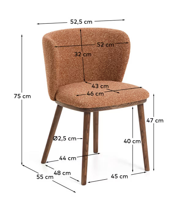 Židle Ciselia spojuje měkkou formu s přírodním dřevěným povrchem, čímž vytváří harmonický a elegantní prvek interiérového vybavení. Čalounění z hrubého šenilu mu dodává příjemnou na dotek, objímající strukturu, která do prostoru vnáší teplo a klid. Nohy z masivního jasanového dřeva v ořechovém odstínu podtrhují nadčasový charakter nábytku a zajišťují stabilitu. Je to čalouněný model, který skvěle poslouží u stolu v jídelně, v obývacím pokoji nebo v prostoru otevřeném do kuchyně.