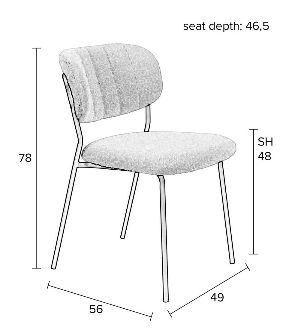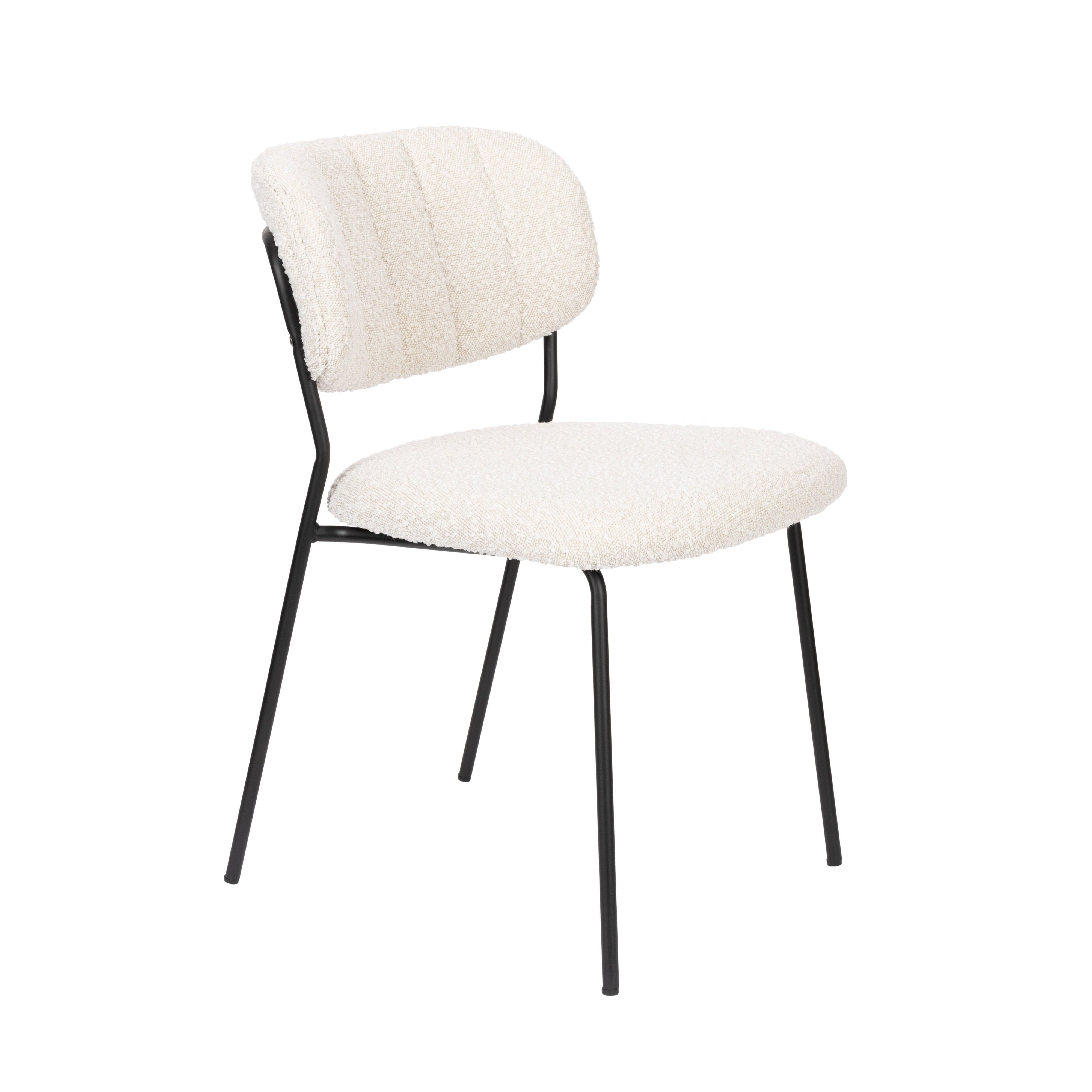 Židle Jolien se vyznačuje elegantním, krémovým bouclé potahem, který jí dodává styl a zajišťuje komfort při používání. Sedák a opěradlo, vyrobené z překližky a potažené PU pěnou, nabízejí pohodlí, a jejich výrazné prohnutí dodává zajímavý vzhled. Základna z černého práškově lakovaného kovu vytváří kontrast s jasnou tkaninou, čímž vzniká harmonická kompozice.