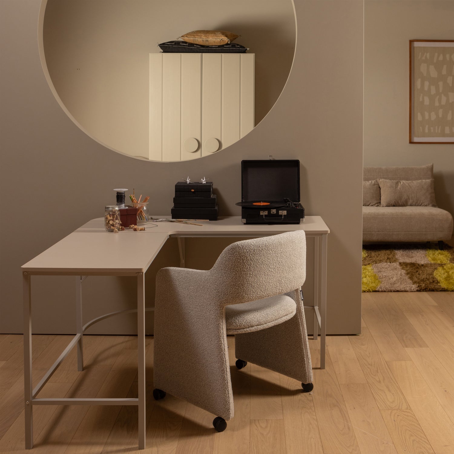 Jídelní židle LYRIC je spojení elegance, komfortu a funkčnosti. Díky pohodlnému sedáku a praktickým kolečkům se židle skvěle hodí jak k jídelnímu stolu, tak do domácí kanceláře. Čalouněné nohy ve stejné barvě jako sedák jí dodávají výjimečný, luxusní vzhled. Tkanina s melírovaným povrchem v odstínu greige jemně podtrhuje moderní charakter interiéru.