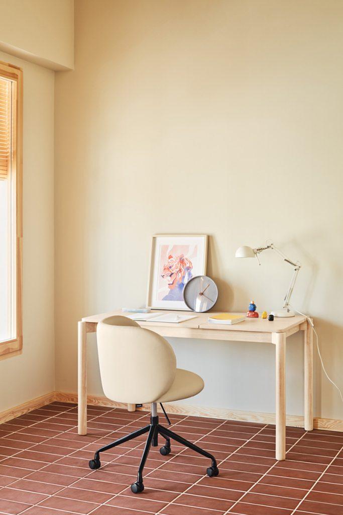 Židle na kolečkách v cihlové barvě s názvem Mogi odkazuje na korejské slovo znamenající komára. Toto výjimečné sezení okouzluje svým elegantním designem s nadčasovými tvary. Díky obklopujícímu tvaru, který poskytuje pocit klidu a pohodlí, se stává ideálním místem k odpočinku.
