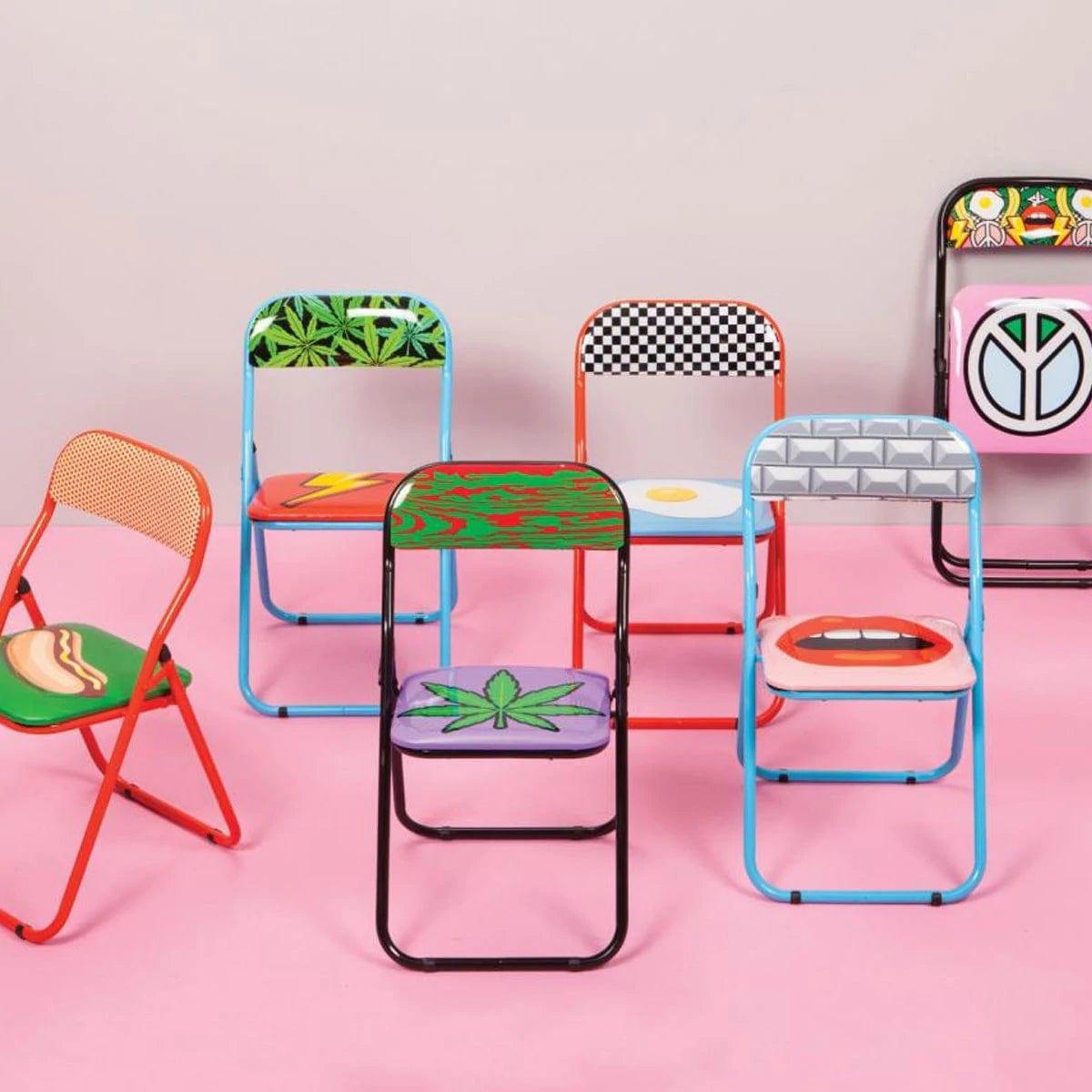 Designerské skládací křeslo ve stylu pop art dodá interiéru surrealistický a zábavný charakter. Celé je vyrobeno z kovu, a plná dynamiky barevnost a lehce kontroverzní koláž vytvářejí originální umělecké dílo.