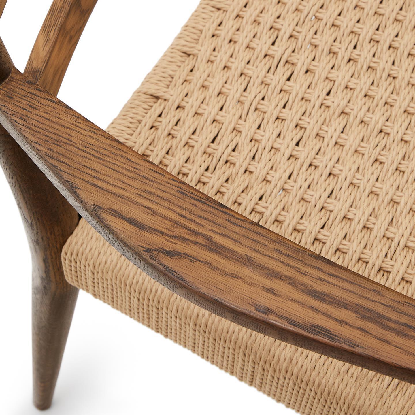 Konstrukce tohoto výjimečného křesla je vyrobena z masivního dubového dřeva, což zaručuje nejen pevnost, ale také trvanlivost na dlouhá léta. Sedák byl pečlivě vyroben z ručně pleteného papírového provázku, což mu dodává jedinečný charakter a zajišťuje bezkonkurenční komfort při používání.