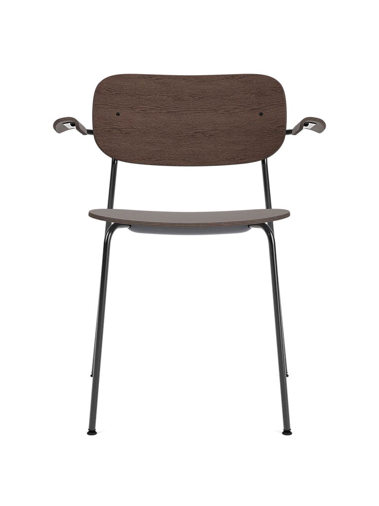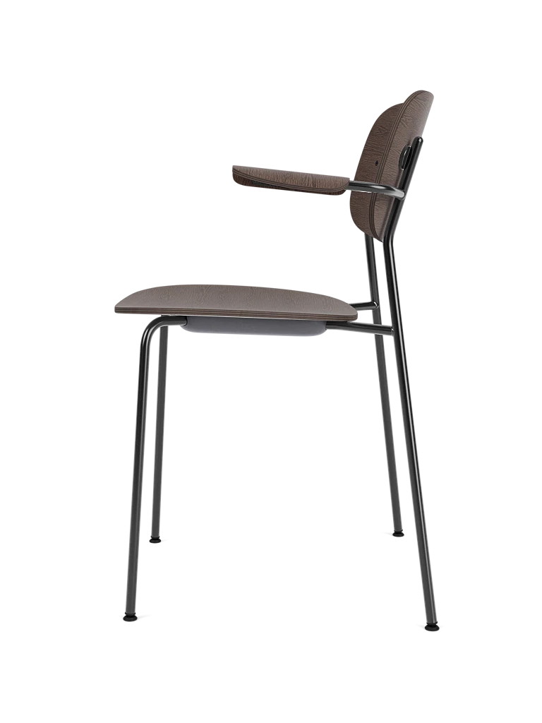 Krzesło Co z podłokietnikami to funkcjonalne i eleganckie rozwiązanie stworzone we współpracy studia Norm Architects oraz The Office Group. Lekka, smukła konstrukcja w połączeniu z formowanym oparciem i siedziskiem z forniru bukowo-dębowego zapewnia komfort, ergonomię i ponadczasową estetykę. Dzięki podłokietnikom krzesło zyskuje dodatkową wygodę, a możliwość sztaplowania do 10 sztuk czyni je praktycznym wyborem także do przestrzeni komercyjnych.