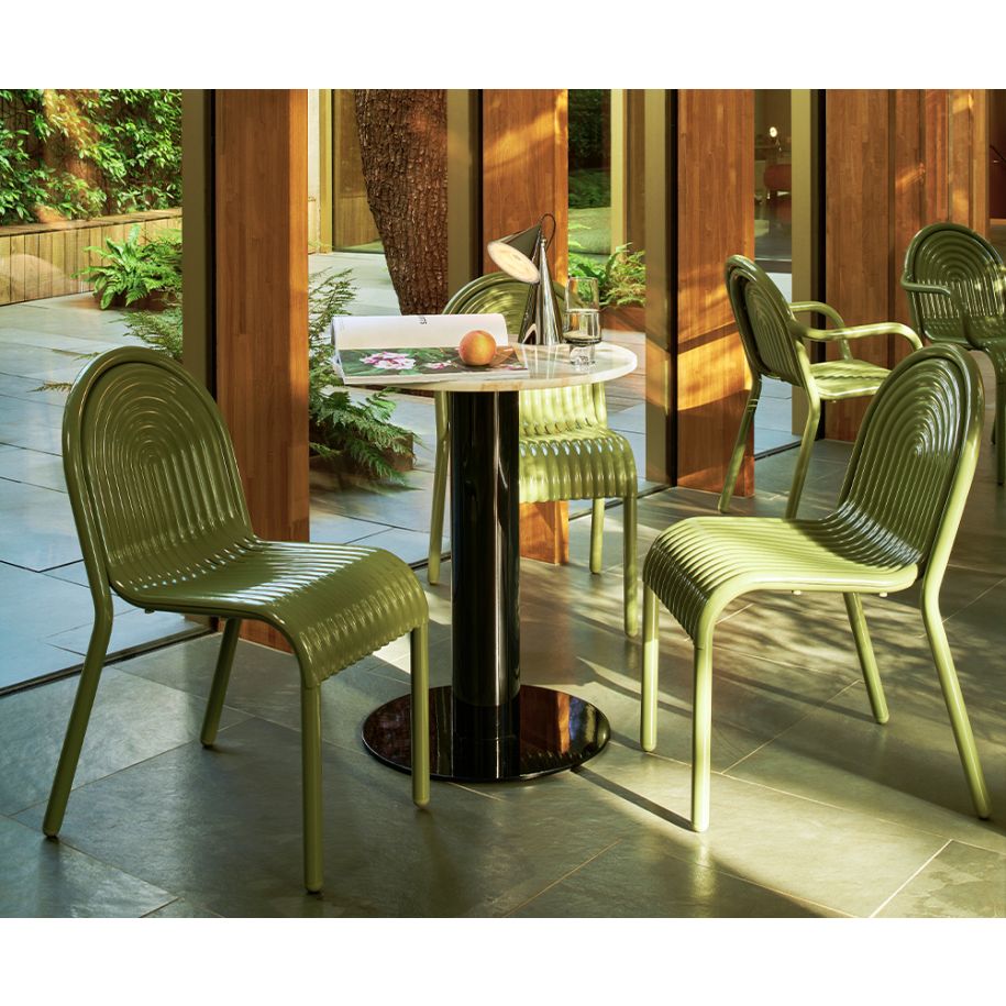 Venkovní křeslo Groove je součástí první kolekce zahradního nábytku od Toma Dixona, inspirované designem hliníkového křesla Hydro z roku 2021. Křeslo se vyznačuje vypouklými drážkami ve stylu art deco a bylo vyrobeno z vysoce kvalitního hliníku, což zajišťuje jeho odolnost proti korozi a trvanlivost. Díky pokročilým výrobním technikám a práškovému lakování, které je bez rozpouštědel a VOC, křeslo skvěle funguje v exteriéru.