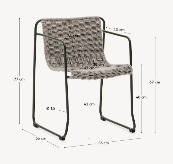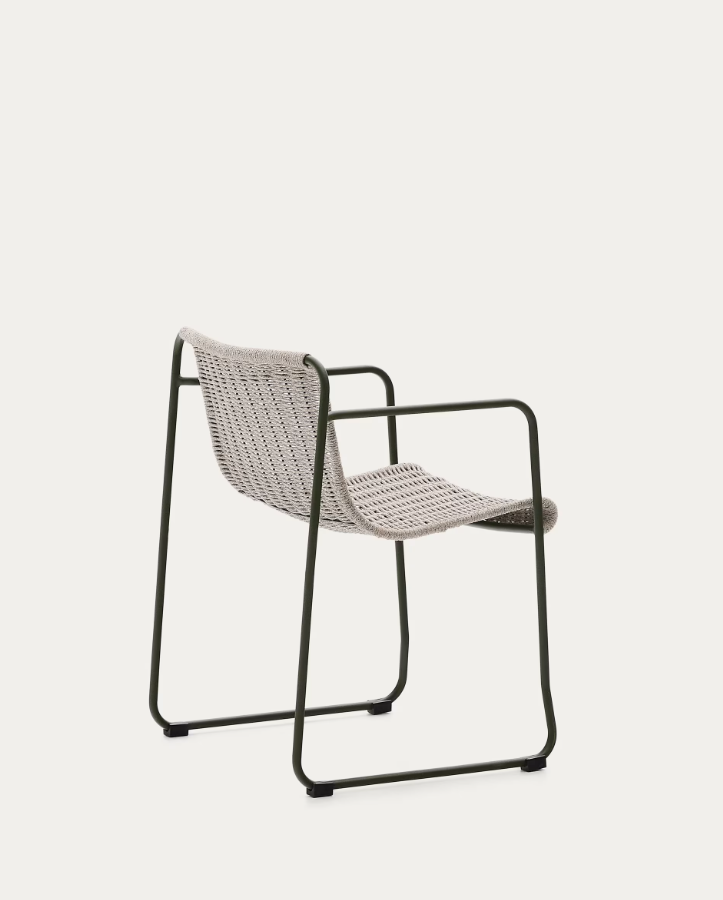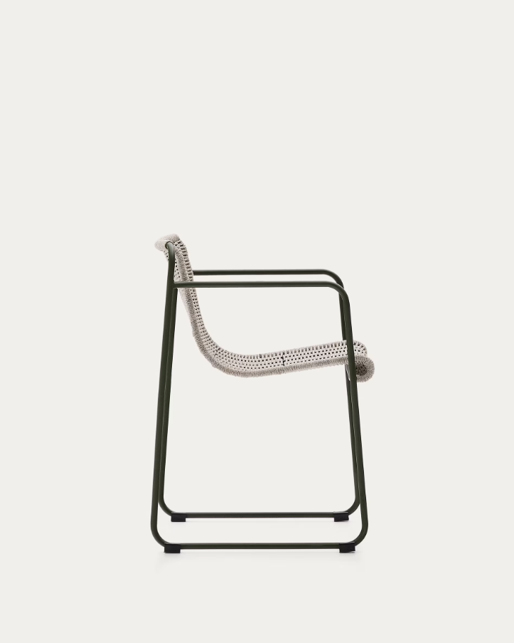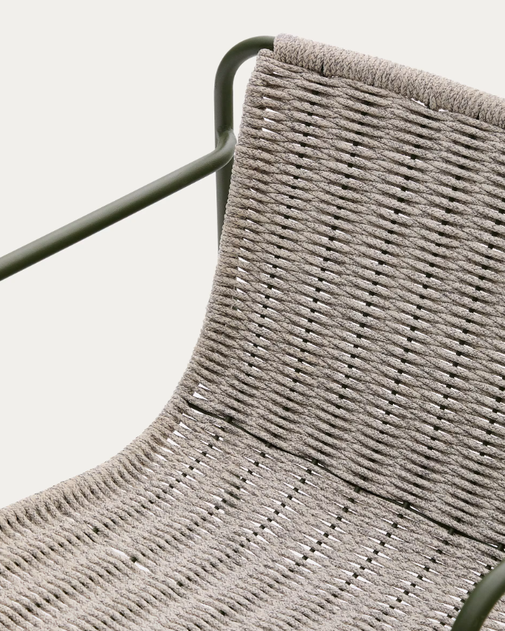 Vyrobená z pozinkované oceli, židle je odolná proti rzi a korozi, což zaručuje její pevnost a dlouhověkost, i v náročných povětrnostních podmínkách. Sedák a opěradlo z ručně pleteného lana odolného proti UV záření zajišťují komfort a prodyšnost, a zároveň dodávají jedinečný charakter.