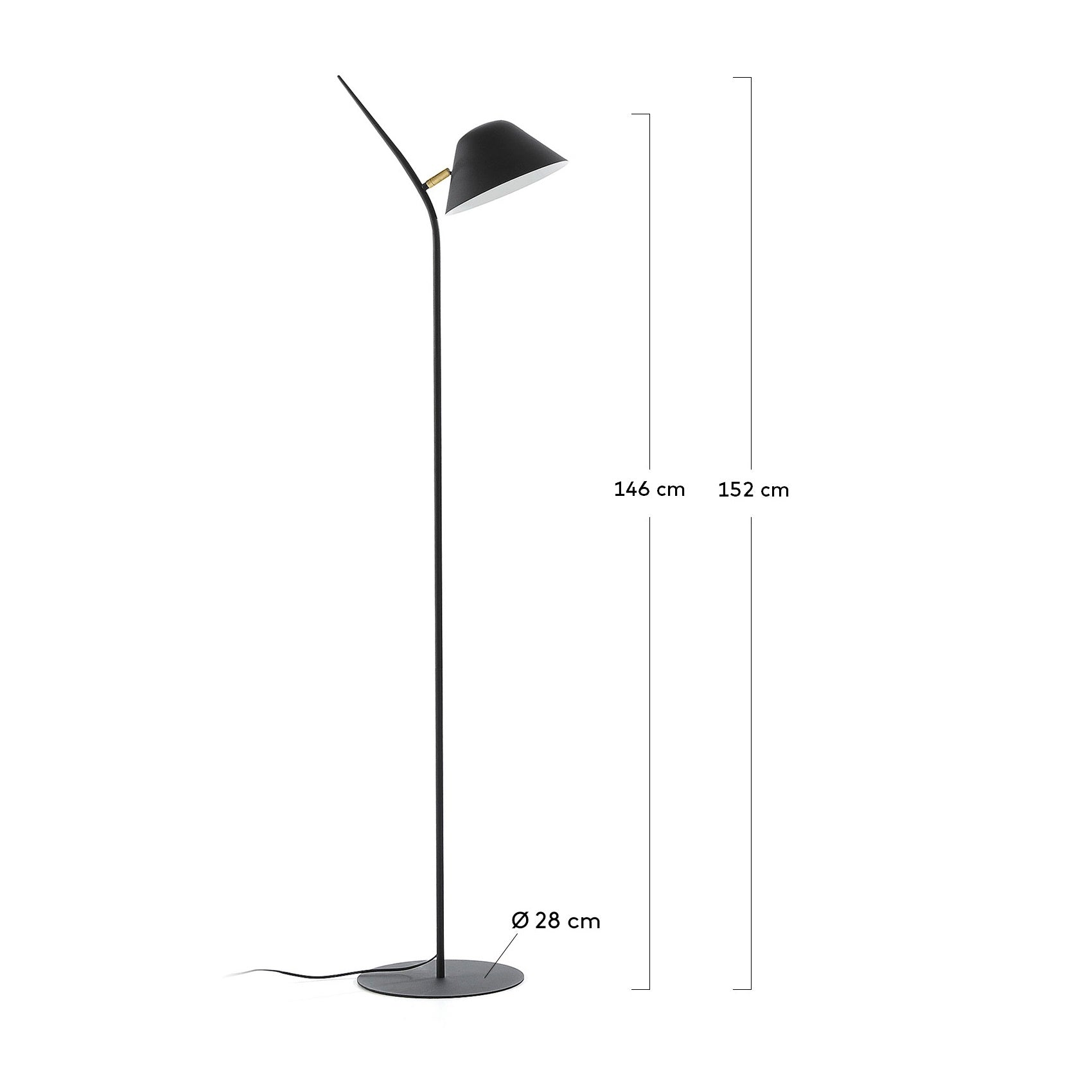 Stojací lampa Aurelia je vyrobena z malované oceli s matným černým povrchem a malým zlatým detailem. Kulatá základna jí zajišťuje stabilitu a kloubový stínidlo umožňuje soustředit světlo tam, kde potřebujete.