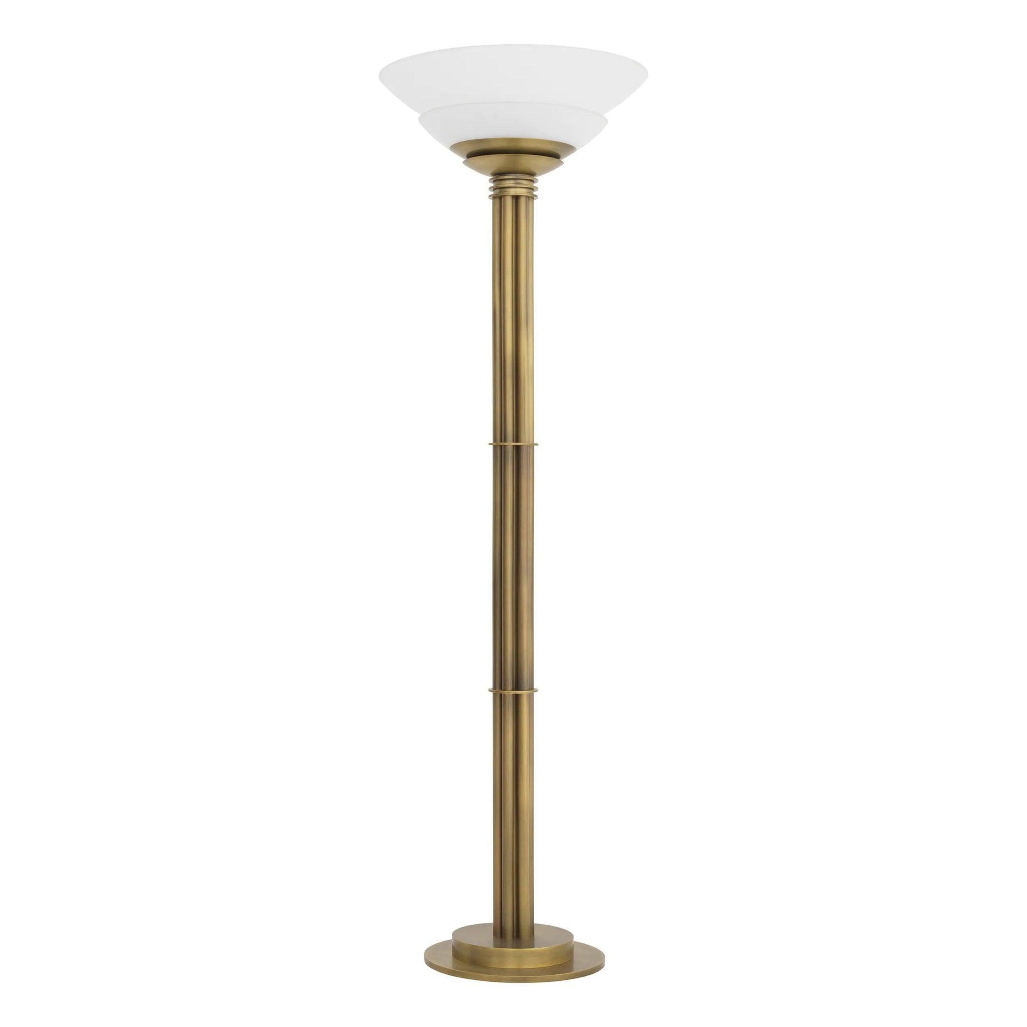 Stojací lampa Figaro je esencí stylu Art Deco, která přináší do vašeho obývacího pokoje nebo ložnice jedinečný náladový lesk. Elegantní základna a tyč, dokončené v jemném antickém mosazném provedení, vytvářejí harmonický kontrast se dvěma stínidly z bílého skla ve tvaru mísy.