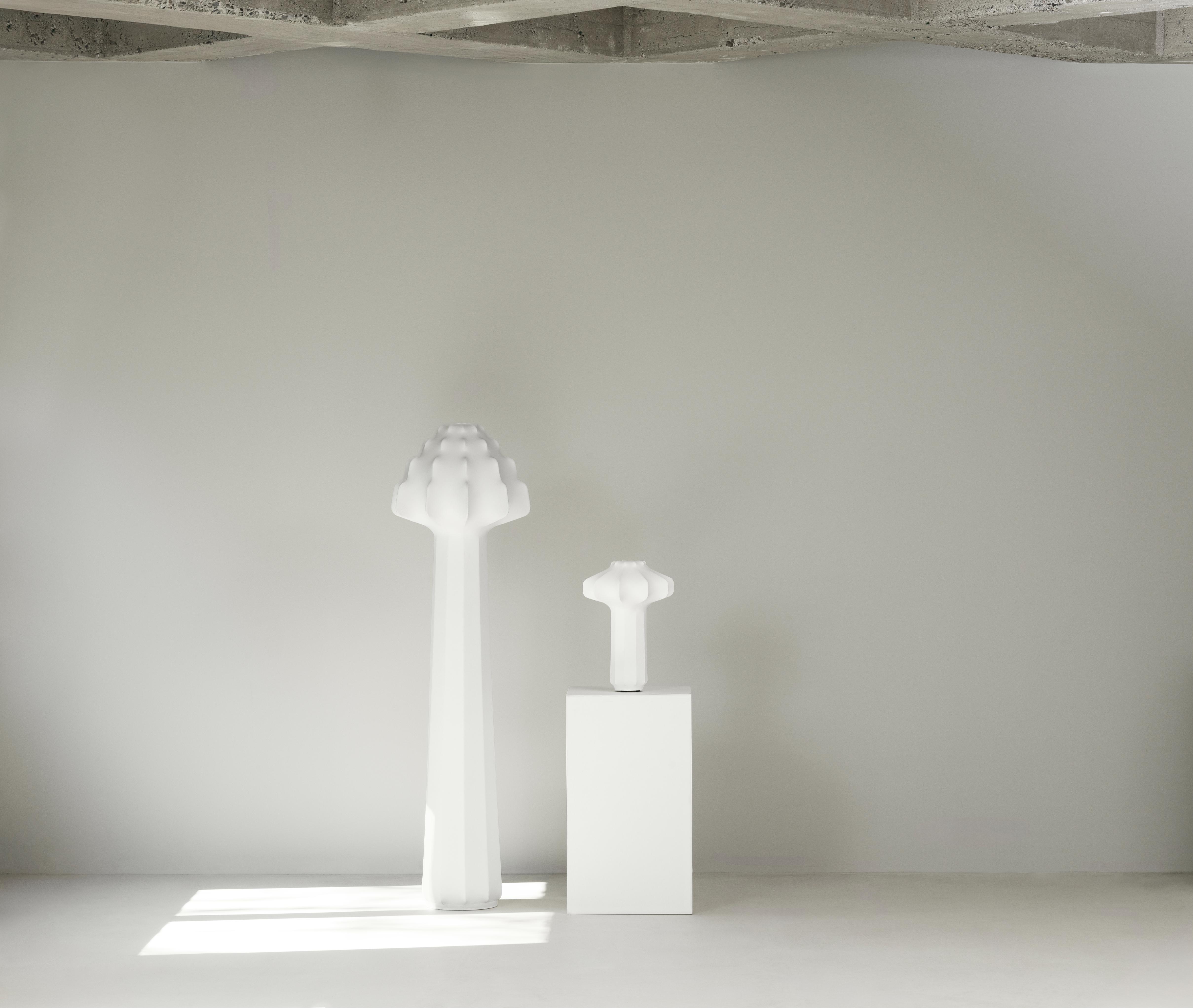 Stojací lampa Phantom je sochařskou formou s impozantní siluetou, která přitahuje pozornost svou éterickou, téměř divadelní přítomností. Inspirací pro její vznik byly archetypální lustry, jejichž klasické linie byly přetvořeny do moderní interpretace pomocí poloprůhledné pryskyřice. Tělo lampy, vyrobené z ocelového rámu, bylo obaleno flexibilním materiálem v procesu připomínajícím vytváření kokonu od bource morušového – díky tomu celá struktura získává měkké, rozptýlené světlo.