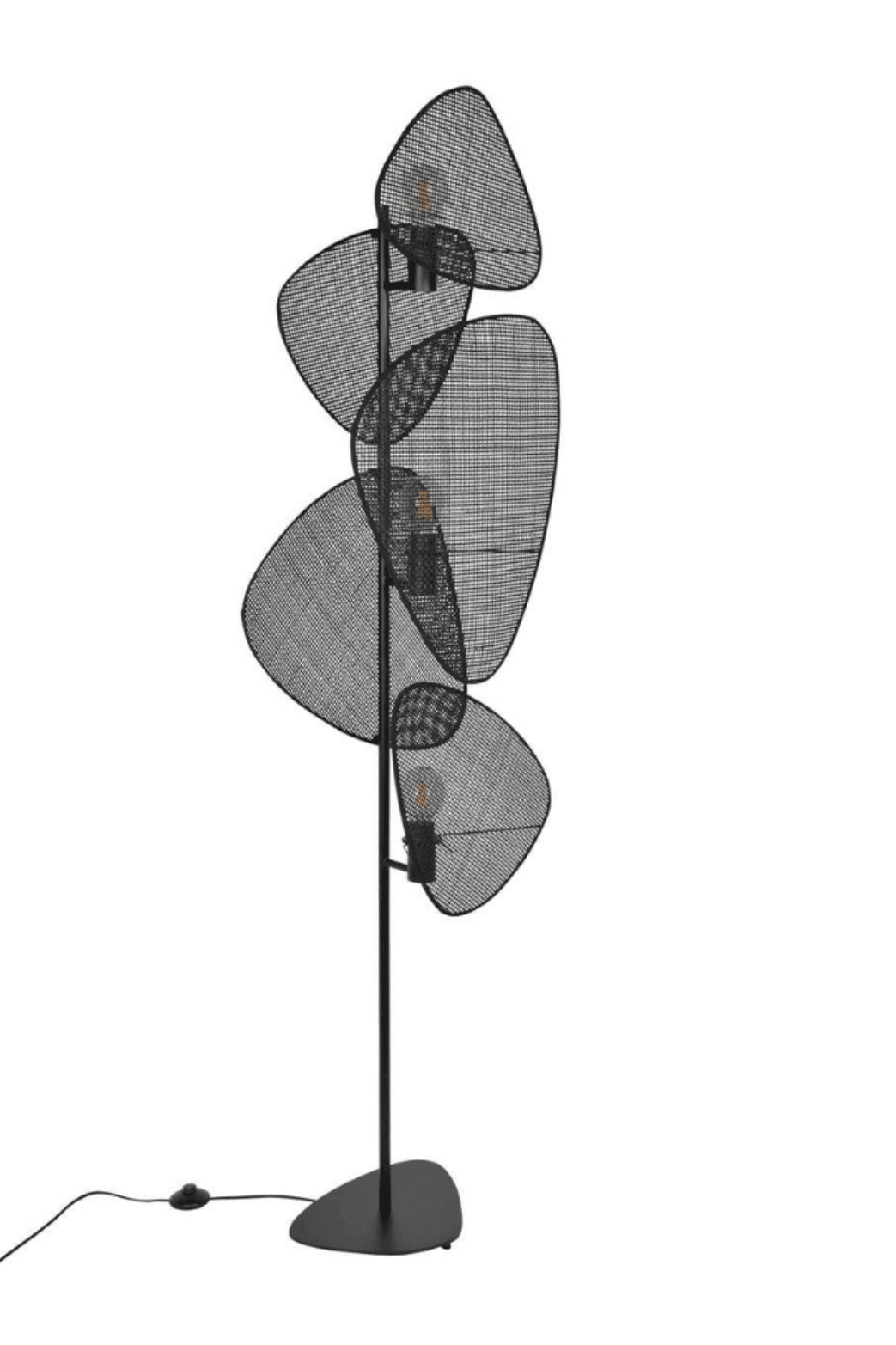 Stojací lampa Screen v černé barvě se prezentuje jako impozantní tříbodová stojací lampa, která spojuje funkčnost s rafinovaným stylem. Disponuje pevnou malovanou kovovou základnou, která zajišťuje stabilitu a elegantní vzhled. Klíčovým prvkem lampy je stínidlo, skládající se z pěti obrazovek vyrobených z rákosu.