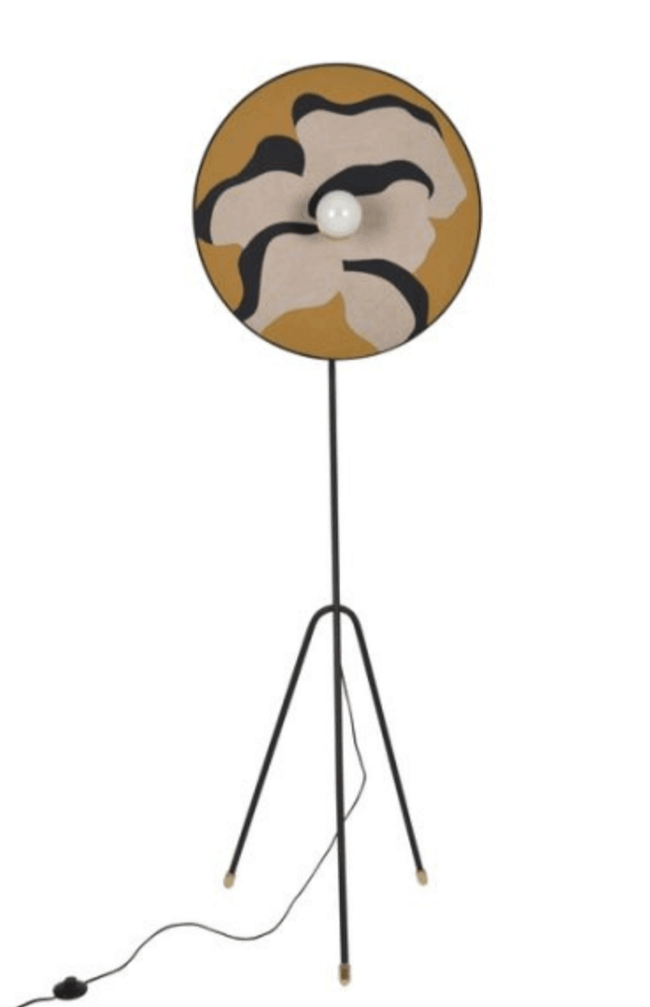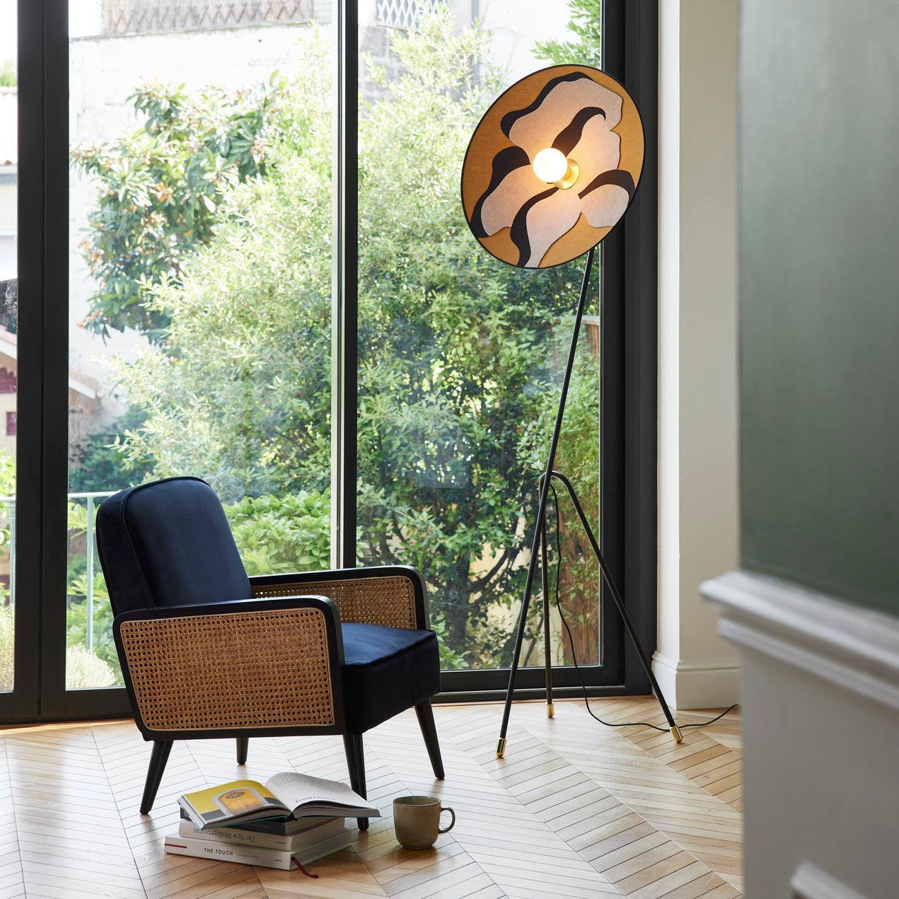 Stojací lampa Soni Laudet v hořčičném odstínu se prezentuje jako elegantní prvek vyrobený z lakovaného kovu s pískovaným povrchem a jemně zpracovanými mosaznými detaily. Její tvar stativu je nastavitelný, což umožňuje přizpůsobení individuálním preferencím.