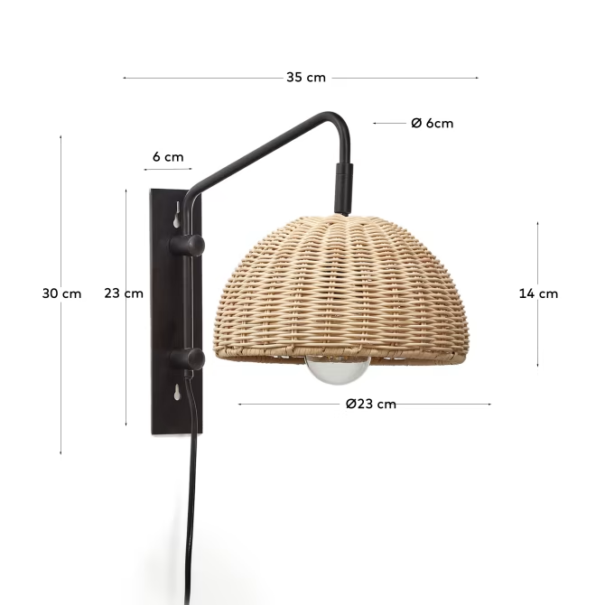 Objevte originalitu a funkčnost v nástěnném svítidle Damila. Nechte svůj domov přirozeně a autenticky odrážet vaši osobnost. Černé svítidlo Damila, vyrobené z ratanu, nejenže osvětlí vaše interiéry, ale také se stane jejich jedinečným akcentem, který dodá charakter a teplo.