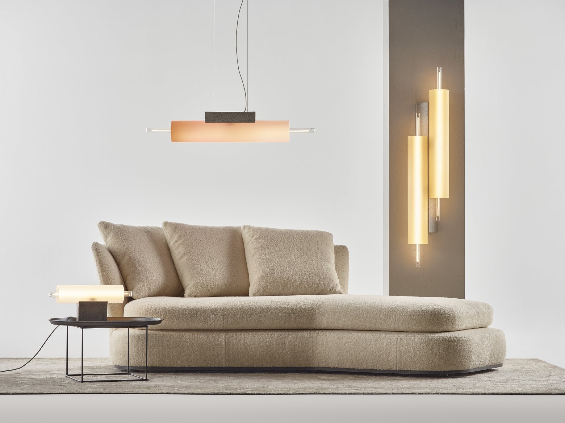 Foukané, průhledné skleněné trubice jsou spojeny s betonovým podstavcem, který obsahuje úlomky recyklovaného skla. Tento betonový základ je speciálně tvarován pro každý typ světla, což umožňuje vytvářet jak jednoduché, tak složité světelné kompozice. V centrální části podstavce se nachází jemný rukáv z matného nebo průhledného skla, skrze který prosvítá světlo, vytvářející efekt, jako by zářivka levitovala uvnitř. Lampa Overlay dodává eleganci a umělecký výraz interiérům, skvěle se hodí jak do domácností, tak do komerčních prostor.